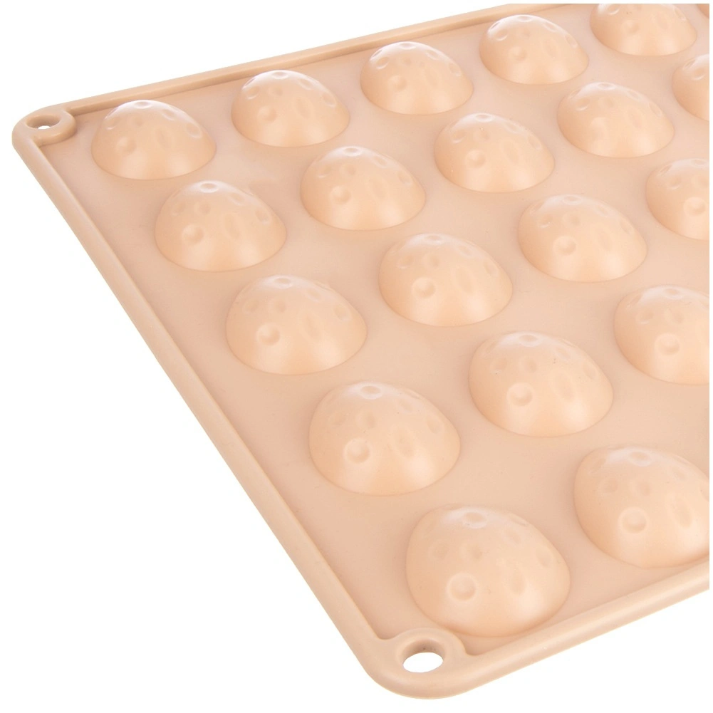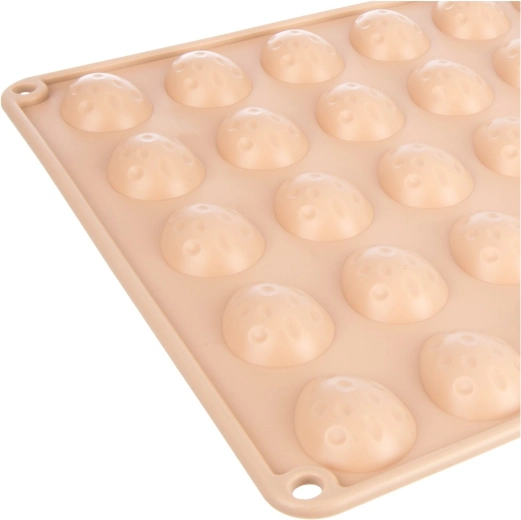 Form med flere huller i målene 33,5 × 26 × 1,5 cm rummer fyrre halvkugler formet som æg på ca. 4 × 3 cm – ideel til praliner, chokolader og minis-måkager.