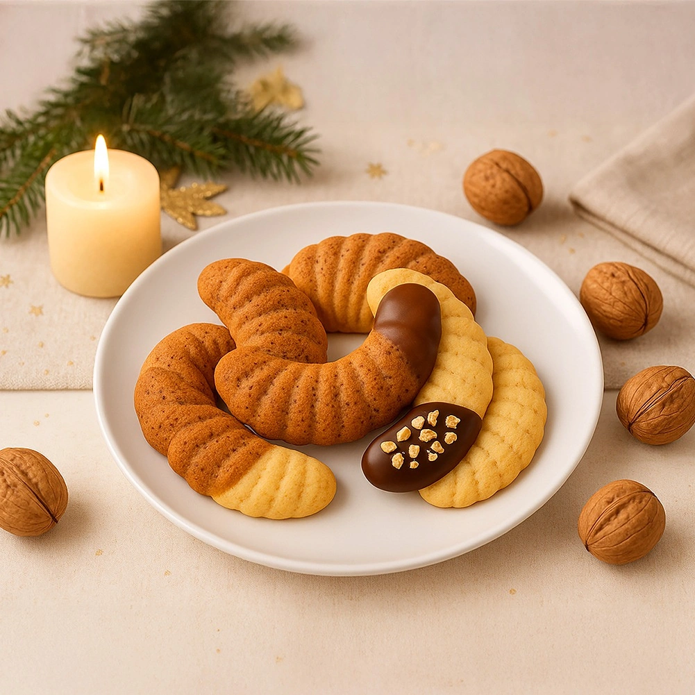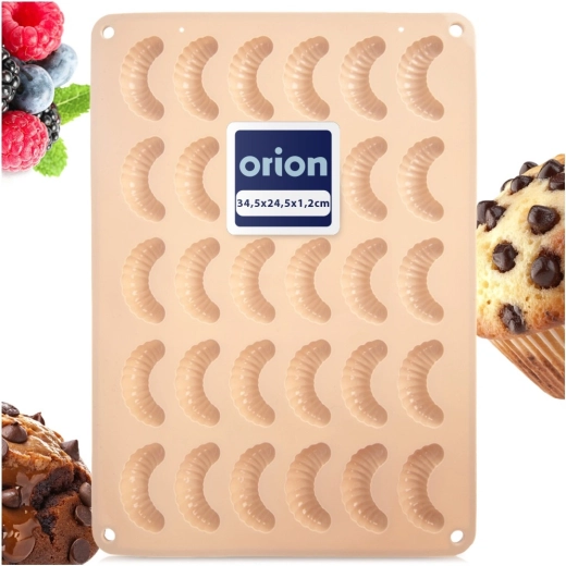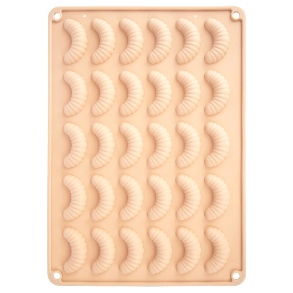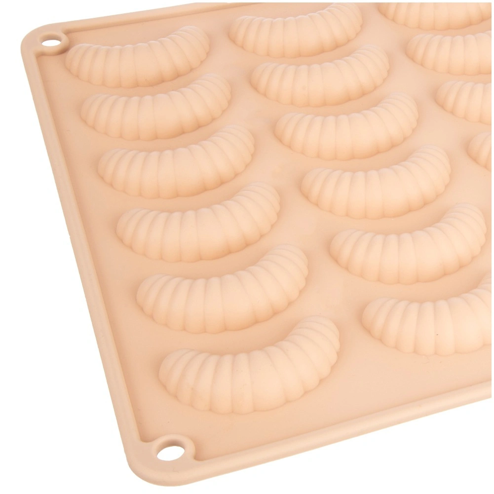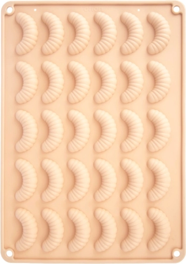 Denne beige silikoneform gør det nemt at tilberede perfekt formede horn på ca. 5,5 cm. Takket være det fleksible og non-stick materiale klistrer dejen ikke, og de færdige stykker kan let tages ud uden at smøre eller drysse. Formen optager ikke lugte eller smag og fordeler varmen jævnt for ensartet bagning.