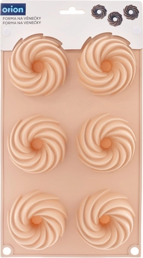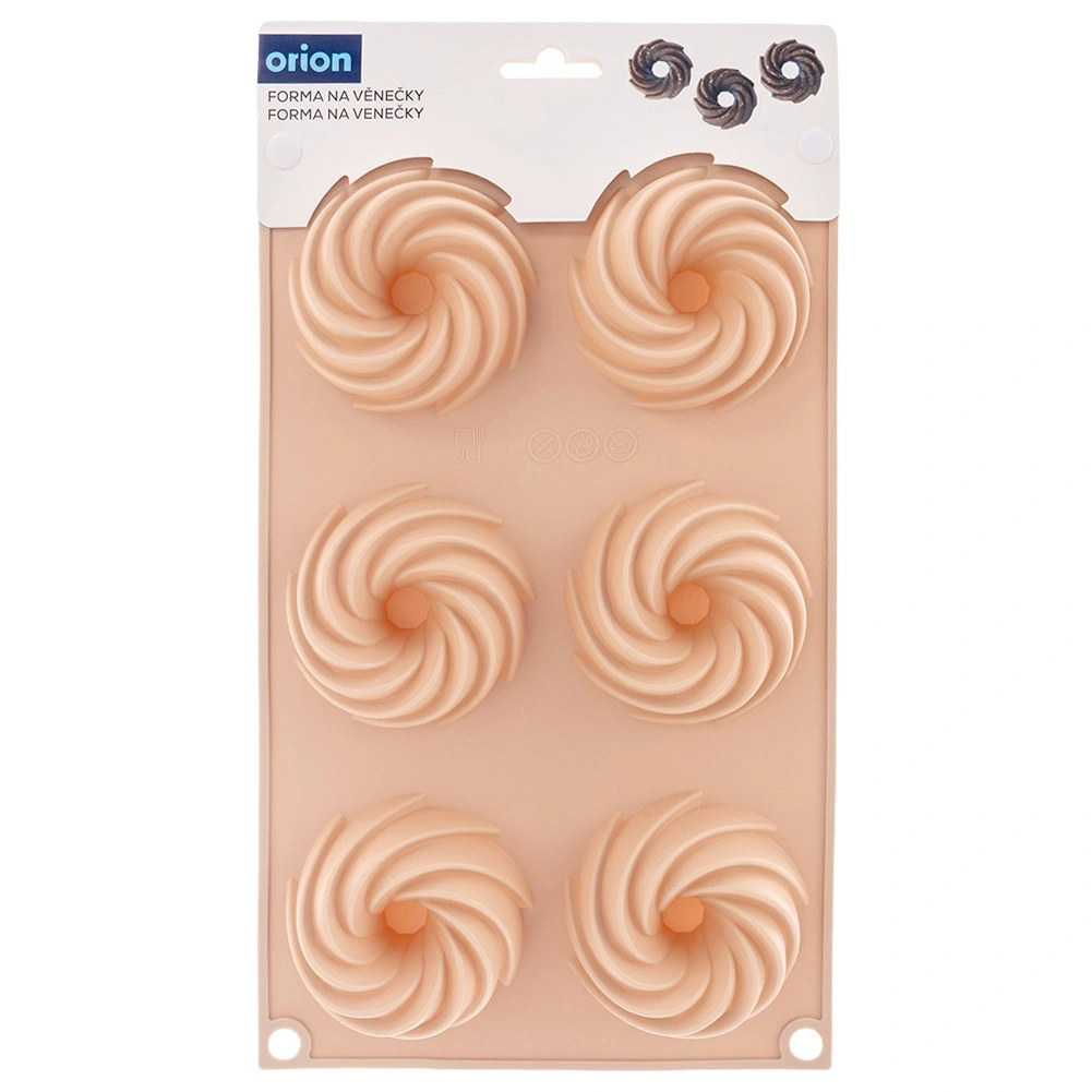 Praktisk silikoneform, der gør det muligt at bage seks muffins, mini-kager eller småkager ad gangen med en dekorativ kranseform. Takket være de centrale skorstene fordeles varmen jævnt, bagværket brænder ikke på og er let at tage ud. Tåler temperaturer fra -40 °C til +220 °C, velegnet til ovn, fryser, mikroovn og opvaskemaskine.