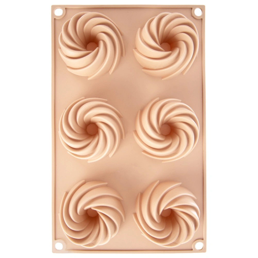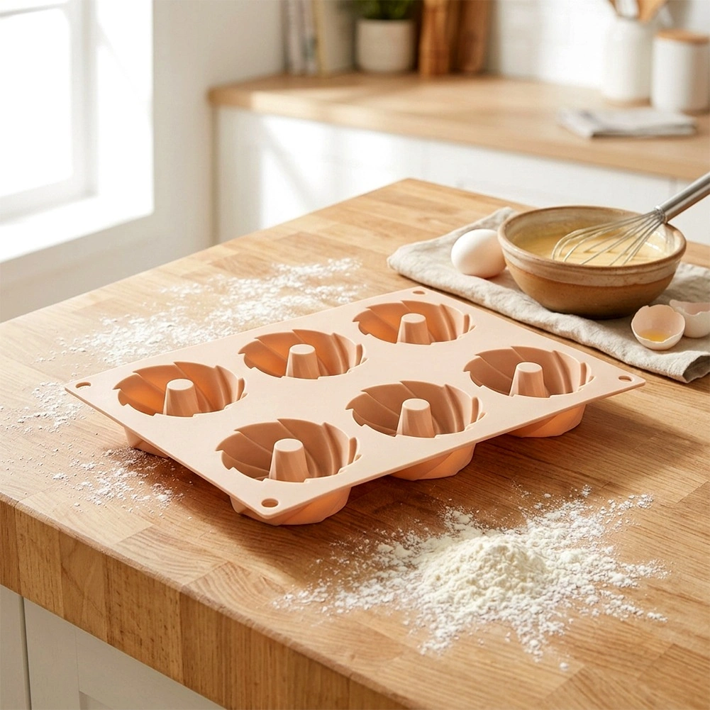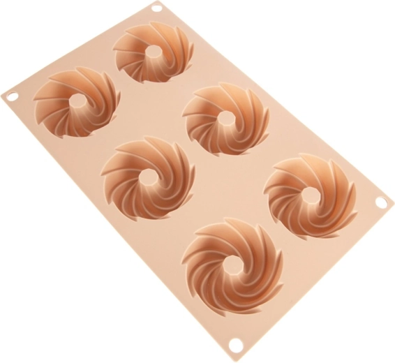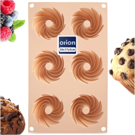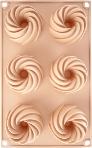 Oplev bekvem bagning med en fleksibel silikoneform i elegant beige. De seks fordybninger med central skorsten skaber en dekorativ kranseform, der ser flot ud på ethvert bord. Materialet er non-stick, formstabilt og optager ikke lugte, så dejen nemt kan tages ud uden ekstra fedtstof.