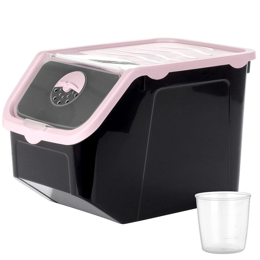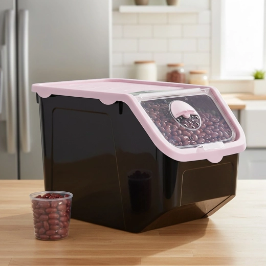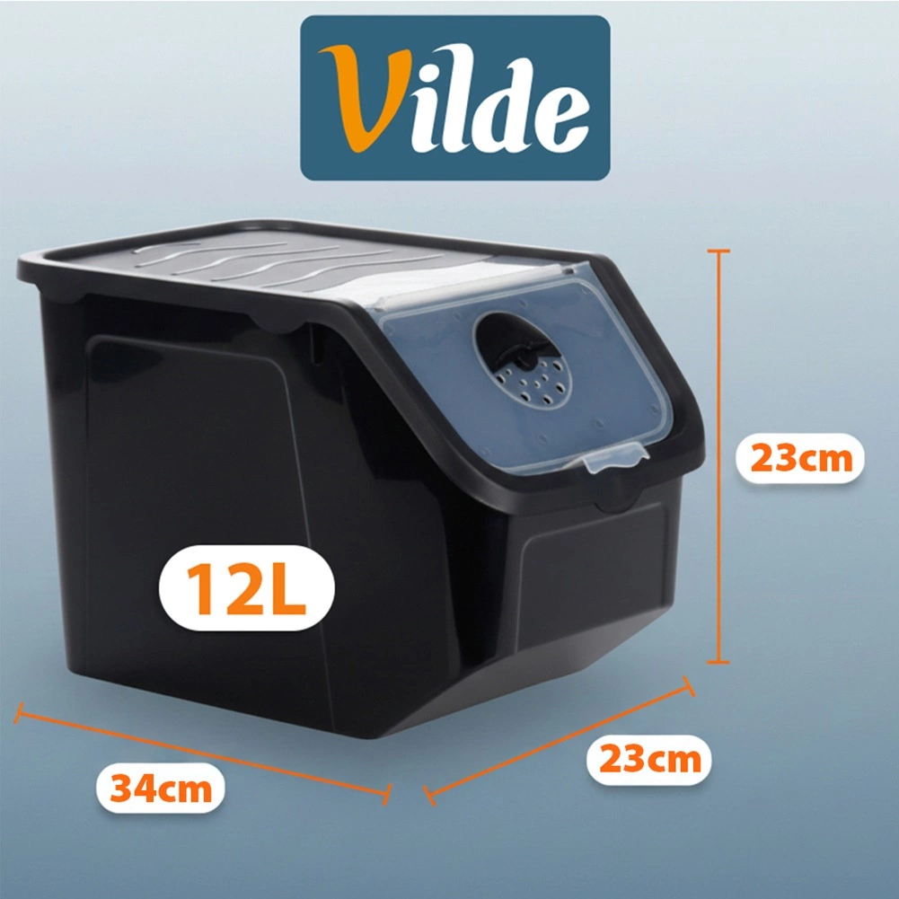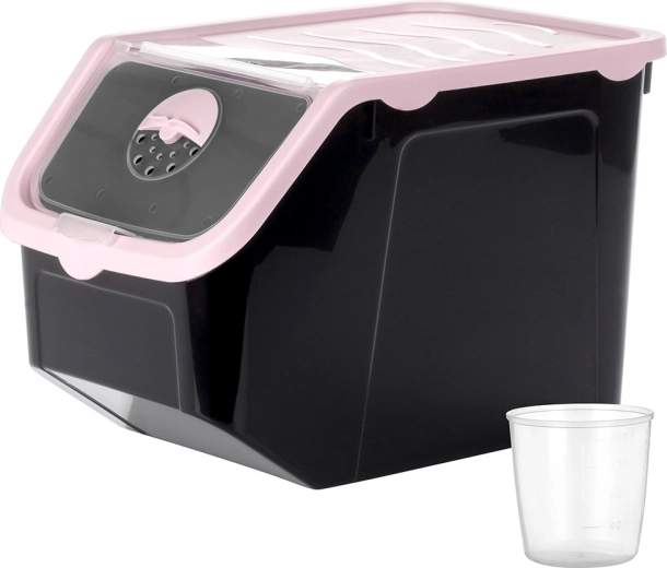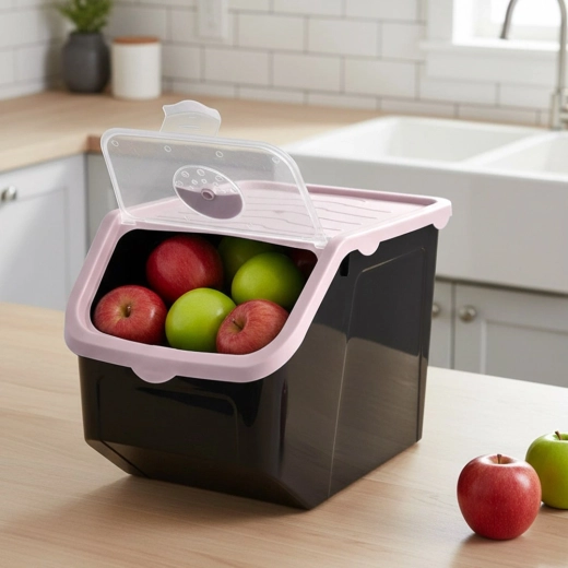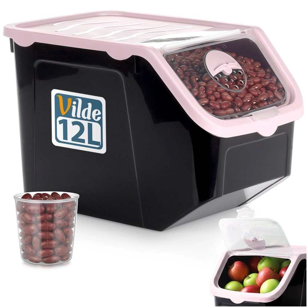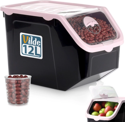 Praktisk beholder af holdbar plast i sort med lyserødt låg, ideel til opbevaring af løg, kartofler, hvidløg, frugt og tørvarer (bælgfrugter, foder, pulvere). Den gennemsigtige frontklap giver hurtig kontrol af indholdet og nem dosering, og låget kan åbnes på klem eller fjernes helt. Materialet er fødevaresikkert, fri for BPA og tåler temperaturer fra -20 °C til 100 °C.