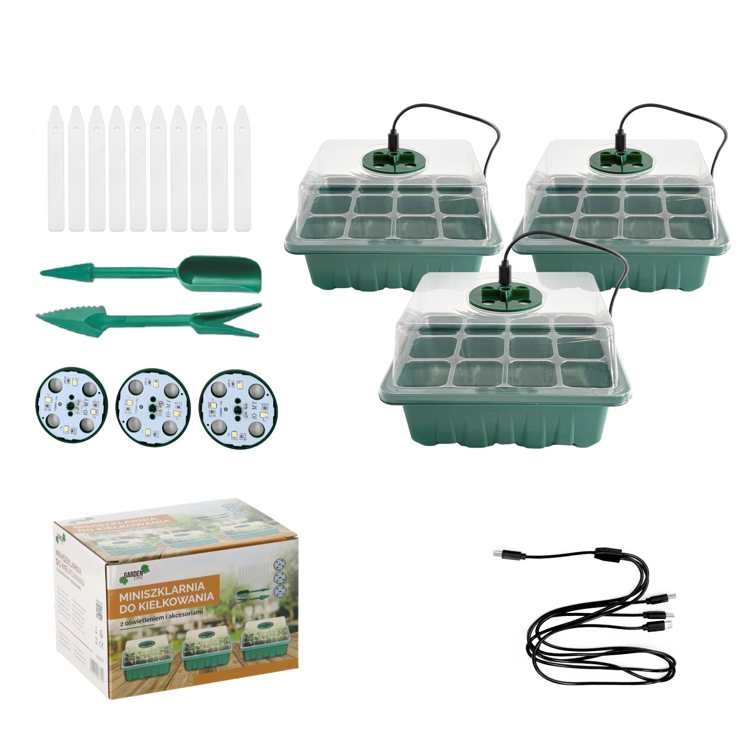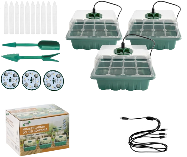 Pakken er designet til at være klar til brug: ud over dyrkningsbakker får du også haveværktøj til omplantning og prikling samt etiketter til tydelig mærkning af sorter. Minidrivhusene passer til vindueskarm, reol eller værksted og hjælper med forspiring af grøntsager, krydderurter og blomster.