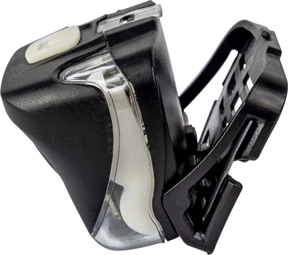 Huset af polycarbonat med gummieret overflade er robust og sikkert ved fald fra op til 80 cm. Betjeningen sker med én øverste knap: hurtigt skift af hvide tilstande og ved at holde nede aktiveres rødt lys. Strømforsyning via 3× AAA (alkaliske eller NiMH), hovedremmen er justerbar, og med IP44-tæthed klarer den også regn.