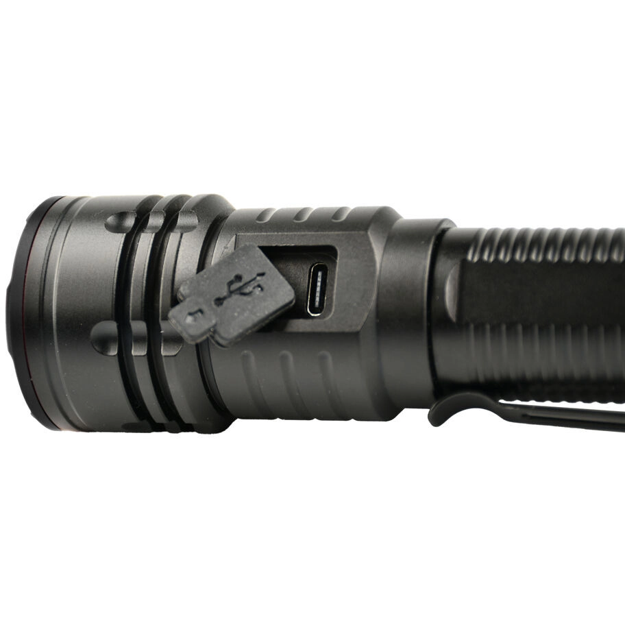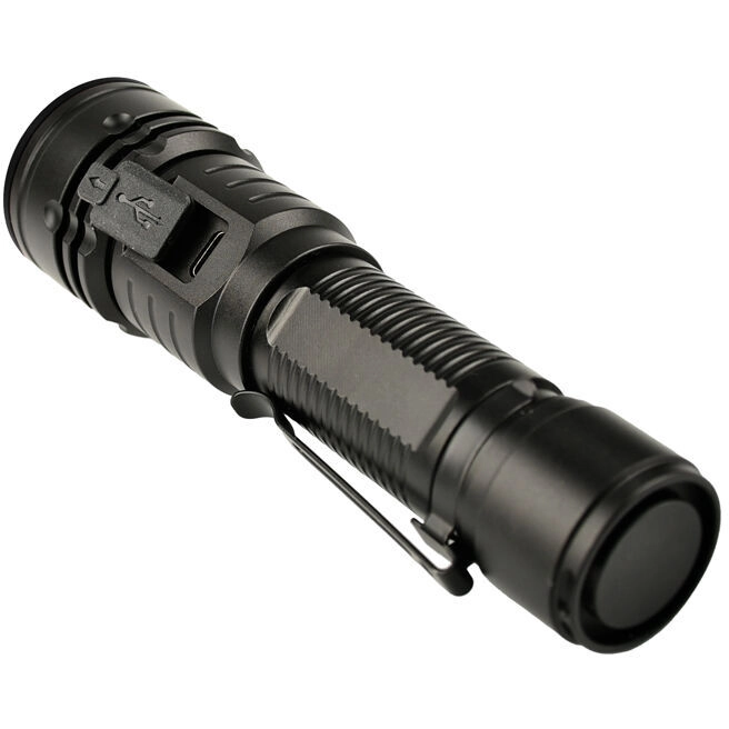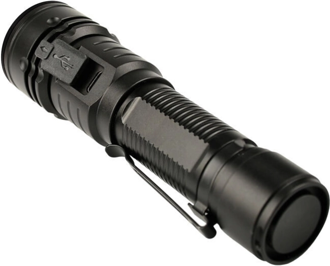 Betjeningen er intuitiv: den sidemonterede gummierede knap gør det let at skifte mellem 3 lysstyrkeniveauer og aktivere SOS i nødsituationer. Den integrerede opladning via USB‑C er praktisk både hjemme og i felten, og det udskiftelige li‑ion 18650‑batteri (2200 mAh) giver op til 8 timers drift. Clipsen sikrer fastgørelse på lomme eller udstyr.