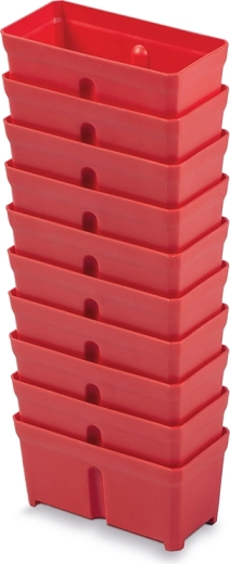 Praktisk sæt med 10 kompakte bokse af holdbar plast til overskuelig opbevaring af små skruer, søm og komponenter. Takket være den stabelbare design spares der plads, den røde farve giver hurtig orientering, og den robuste udførelse tåler daglig brug i værksted, garage og på kontoret.
