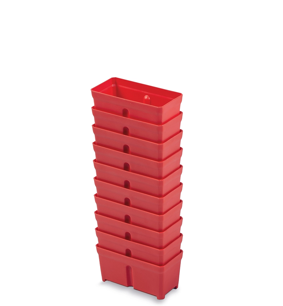 Boksene er fremstillet af holdbar plast, og deres stabelbare konstruktion muliggør fleksibel indretning og maksimal udnyttelse af pladsen på arbejdsbordet, i reolen eller skuffen. Den kraftige røde farve gør det desuden nemt at identificere dem blandt andre værktøjer og materialer.