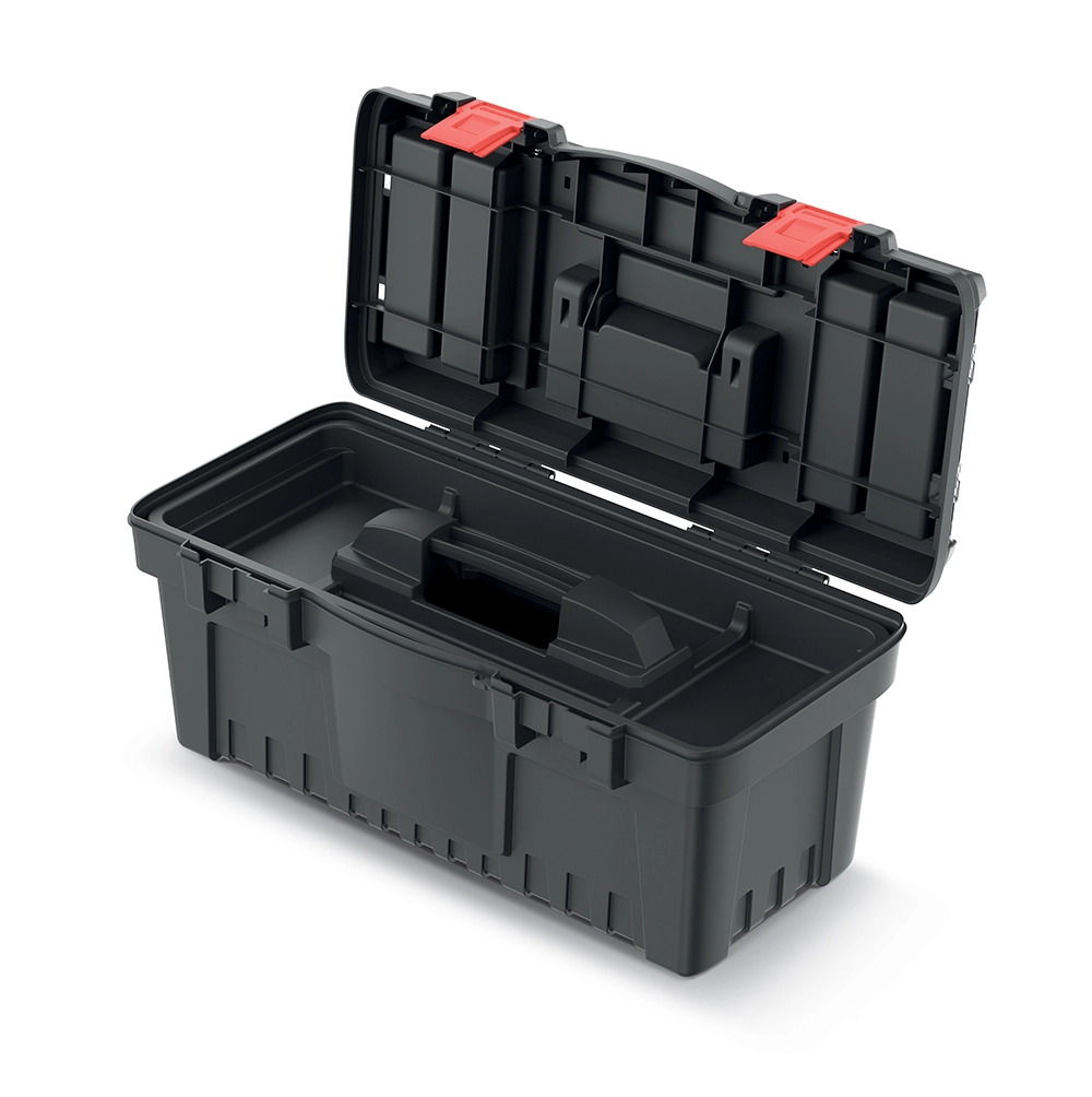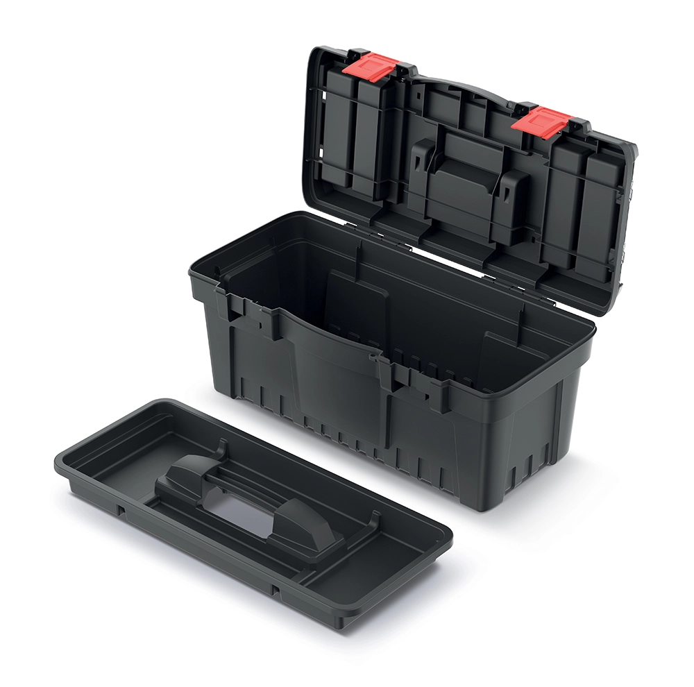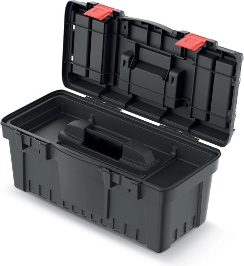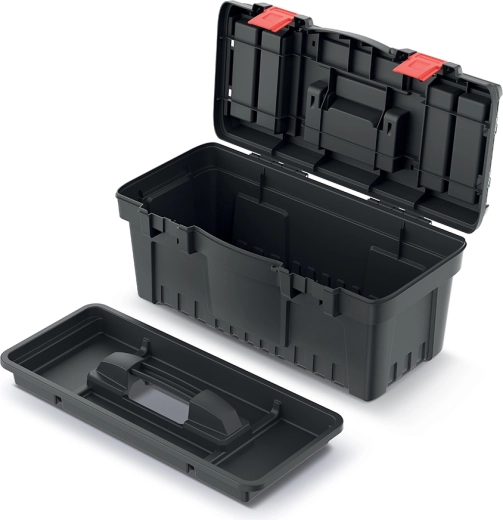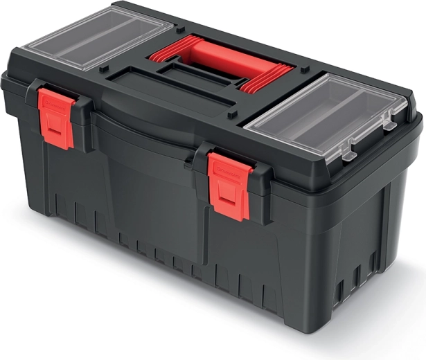 Den praktiske værktøjskasse PROSPERPLAST DARK 55 er en robust og rummelig løsning til overskuelig opbevaring og sikker transport af værktøj. Den tilbyder mål på 54,8 × 27,3 × 26 cm, solid konstruktion af polymerblanding, ergonomisk håndtag og holdbare ABS-låse for pålidelig lukning. To gennemsigtige organisere i låget og en indre indsatsbakke sikrer hurtig adgang og fremragende organisering af smådele.