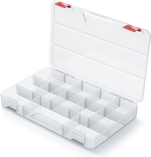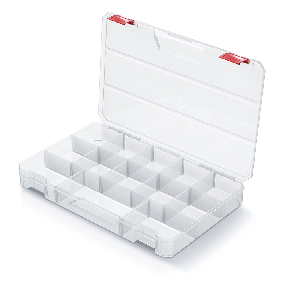 Takket være 11 rum og 8 aftagelige moduler kan du nemt tilpasse den indvendige inddeling til aktuelle behov. Den lette, men robuste konstruktion i plast sammen med solide lukninger sikrer sikker opbevaring og transport af små dele.