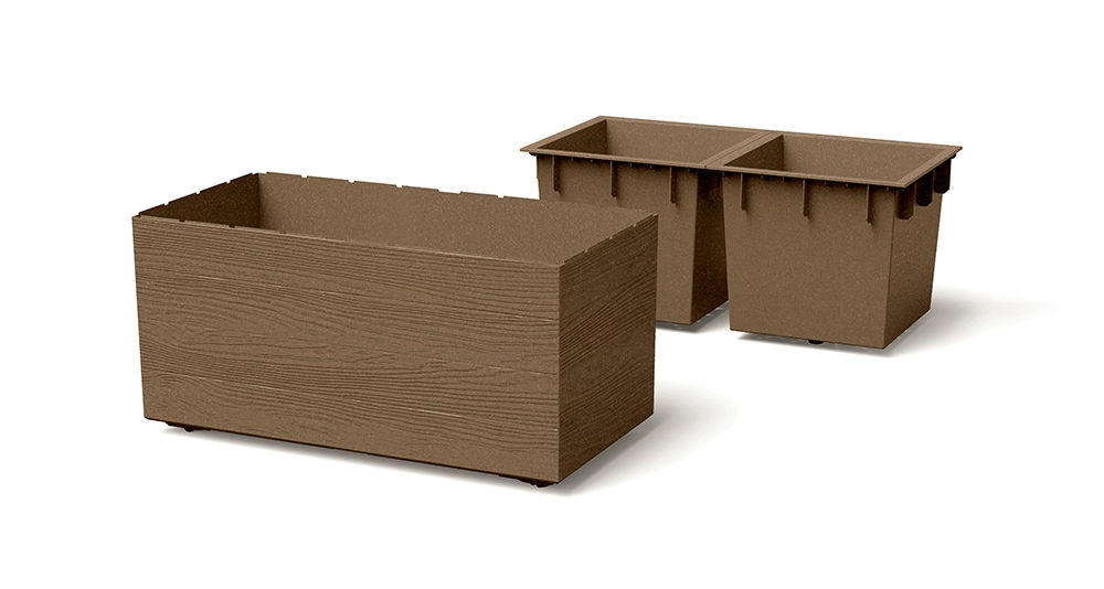 Den rektangulære plantekasse med realistisk træimitation giver et tidløst udseende og praktiske detaljer til ubesværet dyrkning. To adskilte kamre gør det muligt at kombinere forskellige planter, mens integrerede indsatsbakker fremskynder ompotning og fremmer sund vækst takket være korrekt afledning af overskydende vand. Den UV-stabiliserede plast bevarer farve og struktur i lang tid – både i solen og under mere krævende udendørs forhold.