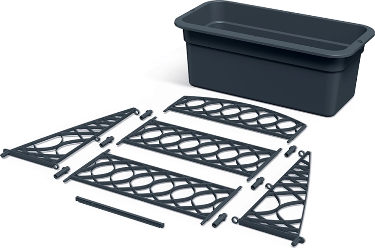 Skab naturligt privatliv og stilfuld lodret beplantning. Plantekassen med pergola i farven grå sten kombinerer en rummelig altankasse med et dekorativt gitter til at lede klatreplanter. Den holdbare konstruktion af let plast er resistent over for UV‑stråling og vejr, så den bevarer farve og form gennem mange sæsoner.