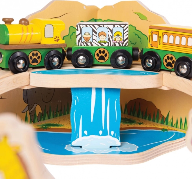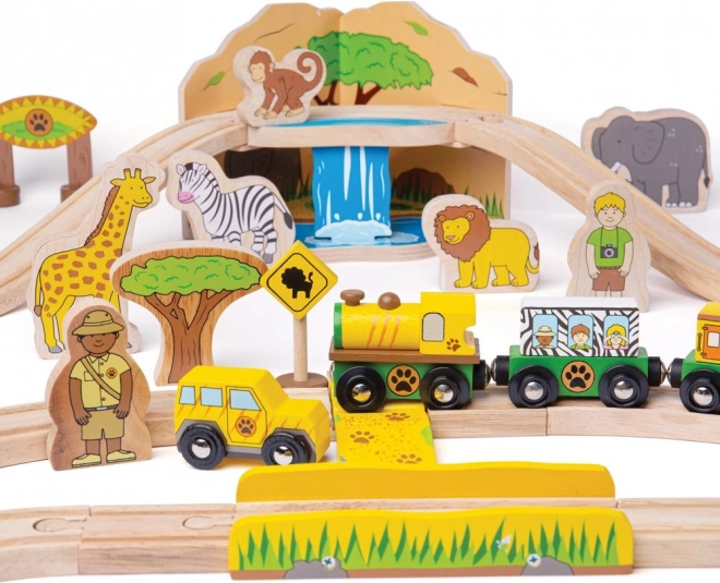 Udforsk safari-verdenen med en farverig og robust træ togbane, der glæder børn fra 3 år. Sættet inkluderer dyr som elefant, zebra og abe, træer, skilte og en bro, som den gule lokomotiv med to vogne kører over. Takket være magnetiske koblinger er legen intuitiv og kan nemt udvides.