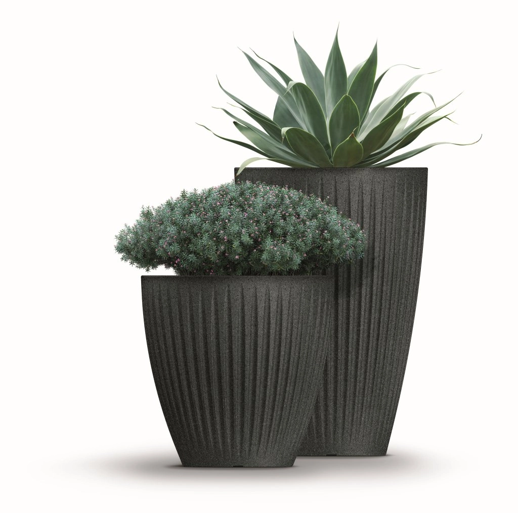 Elegant plantekrukke i farven sort granit kombinerer et moderne udseende med praktisk anvendelighed. Takket være let og holdbar plast er den nem at flytte, UV-stabil og egnet til indendørs og udendørs brug. Den ovale form med diskret lodret rillemønster giver dit rum et sofistikeret udtryk.