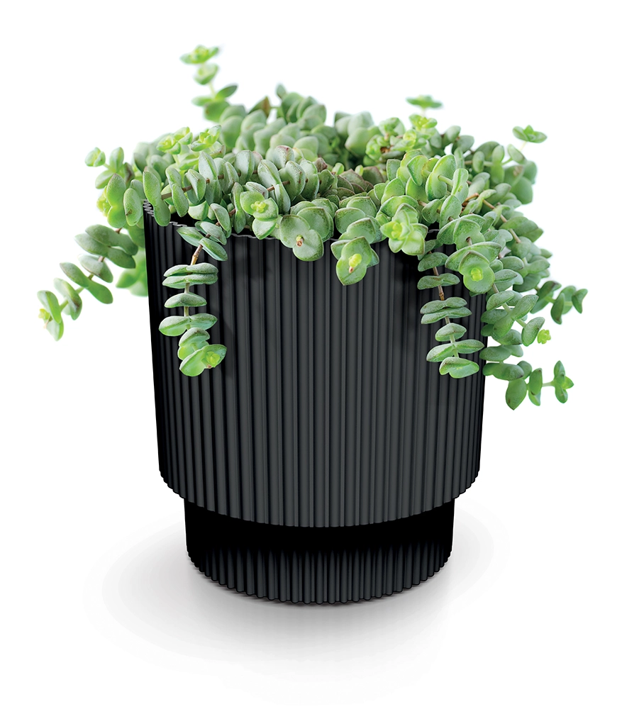 De fine vertikale riller giver dybde og struktur, som fremhæver både grønne blade og blomstrende arter. Krukkens konstruktion understøtter afvanding af overskydende vand og luftning af rødderne, hvilket bidrager til sund vækst og reducerer risikoen for overvanding.