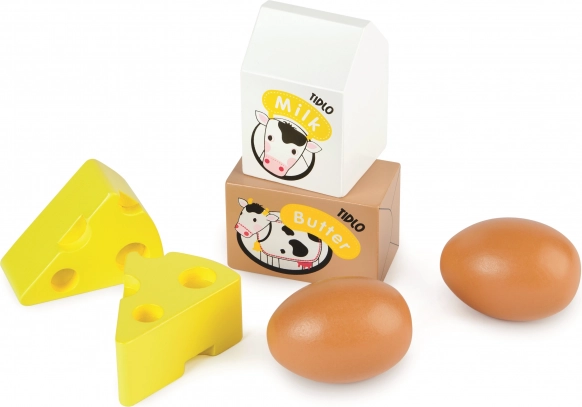 Den træ kasse til børn fra TIDLO bringer mejeriprodukter og æg fra gården i en solid boks med håndtag. Perfekt til butiksleg og kokkeleg, udvikler kreativitet og fantasi. Indeholder 2 æg, 2 skiver ost, smør og mælk. Fremstillet af materialer af høj kvalitet fra ansvarlige kilder, opfylder europæiske sikkerhedsstandarder.