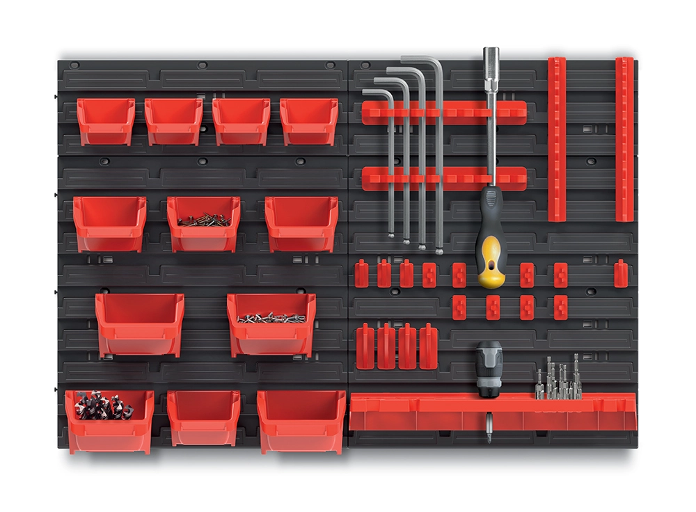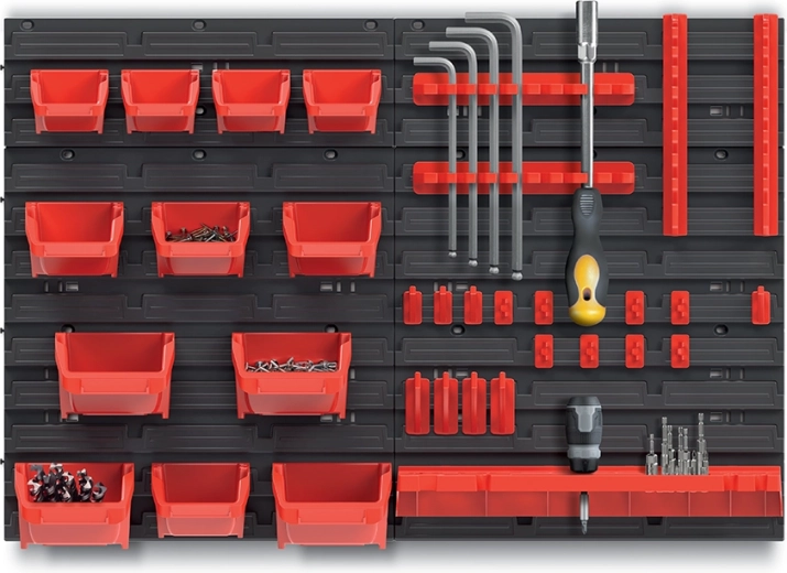 Få styr på værktøj og befæstelsesmateriale med et væghængt system, der kombinerer panel, bokse, kroge og hylde i én funktionel helhed. Den holdbare plast i en elegant sort‑rød kombination sikrer lang levetid og nem vedligeholdelse, mens det gennemtænkte tilbehør giver hurtig adgang til alt, du har brug for under arbejdet.