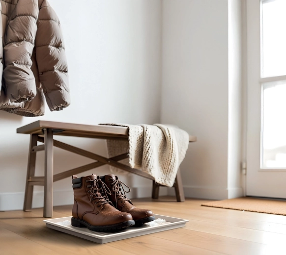- Hverdagens praktik: ideel til at sætte mudret fodtøj eller skåle til kæledyr.