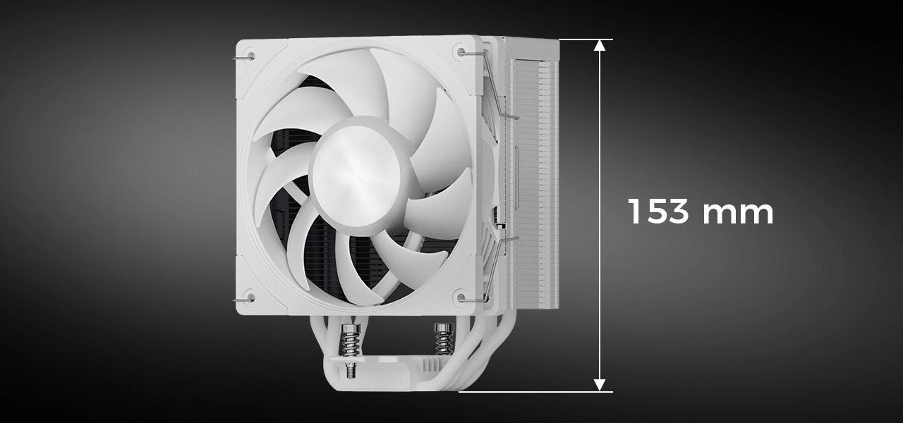 Fire kobber-heatpipes transporterer varmen fra den spejlpolerede bundplade til tætte aluminiumsfinner, hvor en 120 mm PWM-blæser med område 600–2000 o/min bortventilerer den. Resultatet er høj luftgennemstrømning på 75 CFM og lavt støjniveau omkring 28 dBA – ideelt til natgaming og stille arbejdsrum. En højde på kun 153 mm gør monteringen lettere i de fleste ATX-kabinetter.