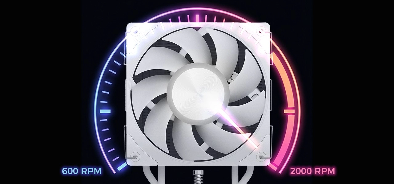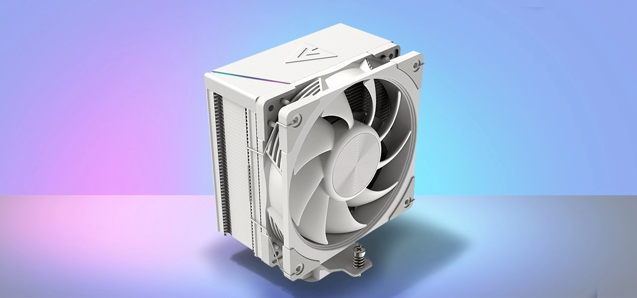 Stilrent hvidt tårn-CPU-køler med 120 mm blæser og ARGB LED til minimalistiske builds. Tilbyder fire varmerør, optimerede aluminiumsfinner, stille drift op til 28 dBA, luftgennemstrømning 75 CFM og PWM-styring 600–2000 RPM. Inkluderer også termisk pasta for nem installation.