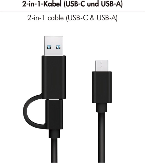 Installationen tager kun få sekunder takket være værktøjsfri montering. Det medfølgende fleksible 2‑i‑1‑kabel (USB‑C/USB‑A) giver maksimal kompatibilitet med bærbare, stationære pc’er og udvalgte telefoner. Plug & Play‑teknologien muliggør øjeblikkelig brug uden kompliceret opsætning.