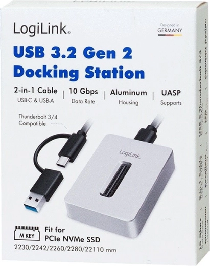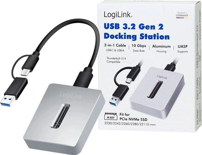 Forvandl din M.2 NVMe SSD til en hurtig, bærbar lagerenhed. LOGILINK dokningsstationen med USB 3.2 Gen 2 tilbyder overførselshastigheder op til 10 Gb/s, værktøjsfri installation, 2-i-1 USB‑C/USB‑A‑kabel og et aluminiumskabinet for effektiv køling. Plug & Play-kompatibilitet med alle gængse systemer gør både backup og gendannelse nemt.