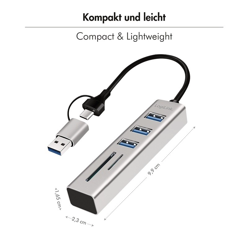 Den elegante og lette LogiLink‑hub omdanner øjeblikkeligt én port til tre hurtige USB 3.0 samt to kortlæsere. Ingen drivere – tilslut og begynd at kopiere billeder, video og dokumenter. Takket være 2‑i‑1‑tilslutning (USB‑C/USB‑A) er den kompatibel med moderne bærbare såvel som ældre computere og periferiudstyr.