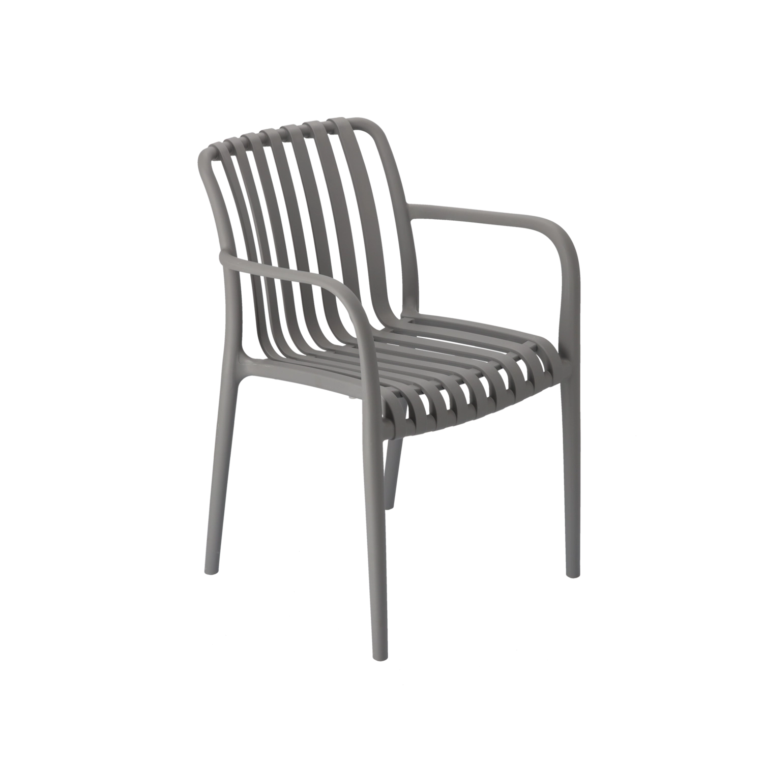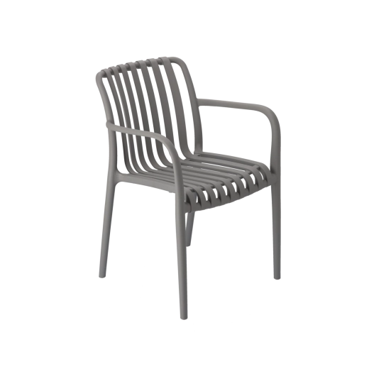 Denne grå havestol kombinerer moderne design og praktisk anvendelighed. Takket være materialet med UV-filter bevarer den længe sin farve og sit udseende, selv i sollys. Den er let, stabil og giver med sin ergonomiske form komfortabel støtte til ryggen til daglig brug i haven, på terrassen eller altanen.