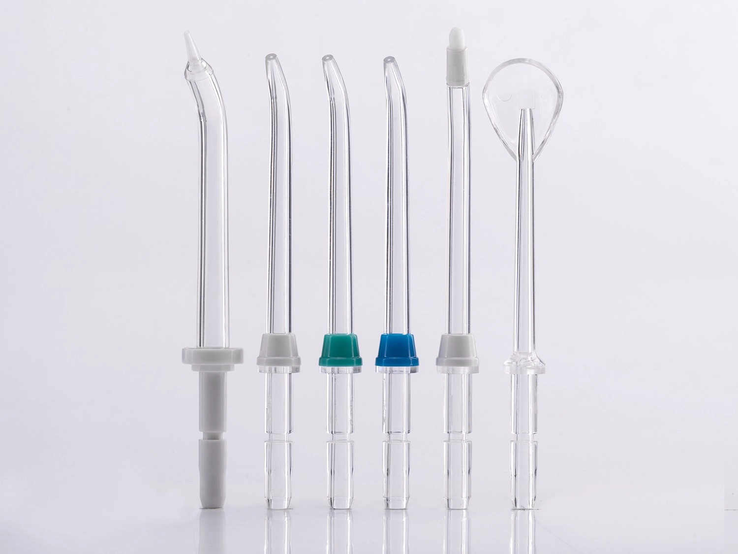 - 6 (3× standarddyse, tungeskraber, parodontalmundstykke, ortodontisk mundstykke)