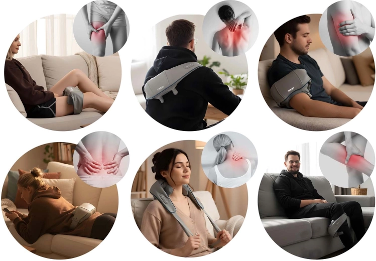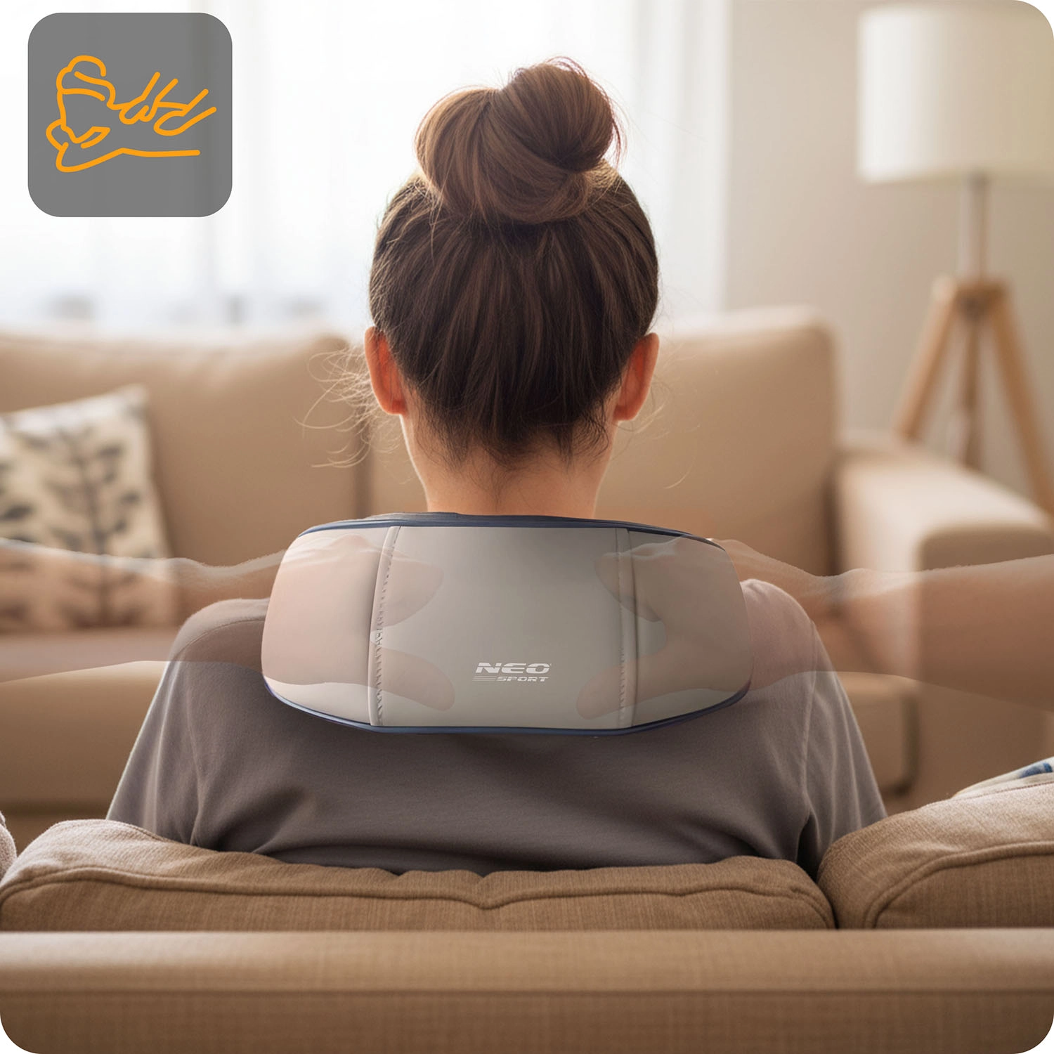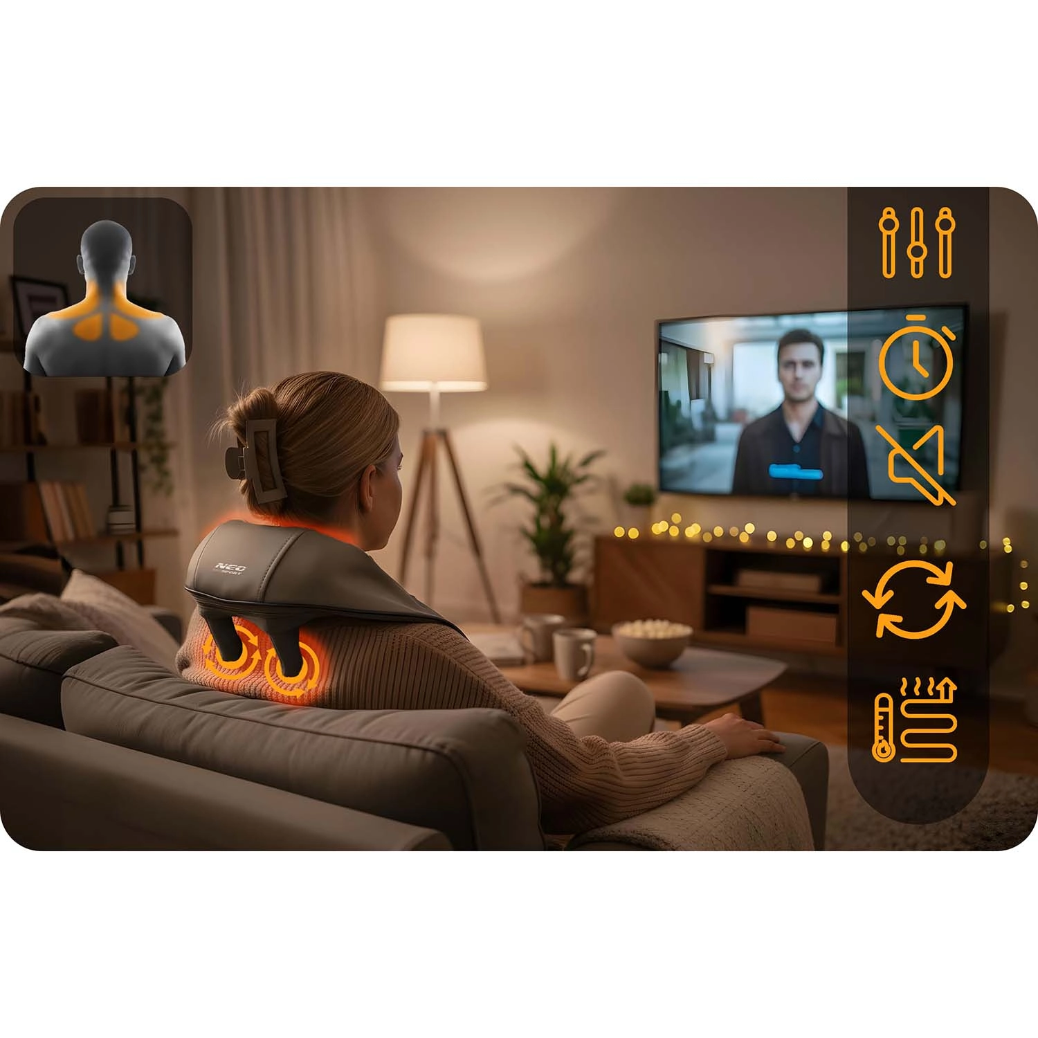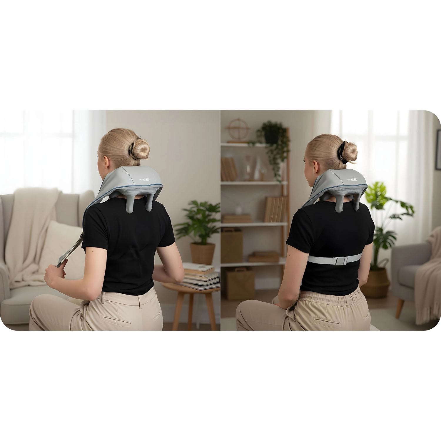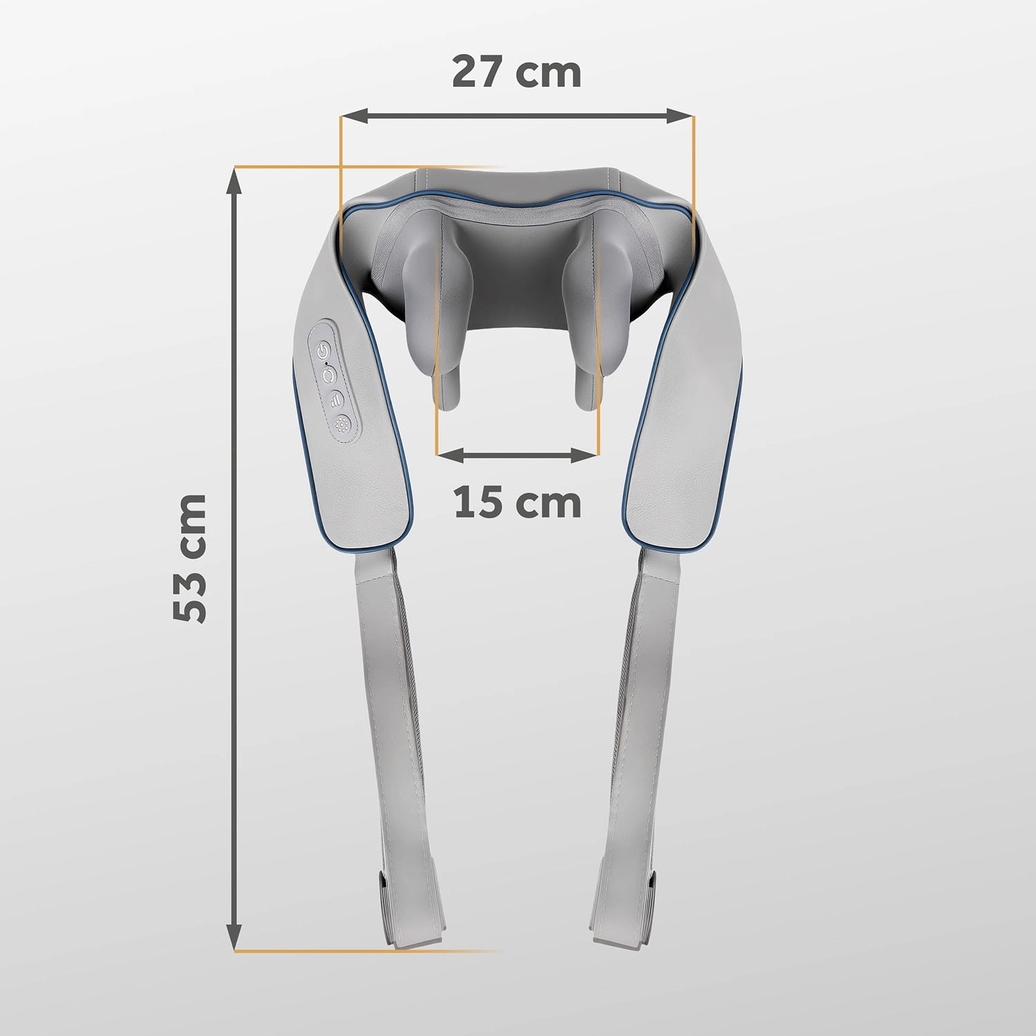 Oplev massage som fra en professionel. Denne ergonomiske massager efterligner troværdigt shiatsu-teknikken – dyb æltning løsner effektivt nakkehvirvler, trapezmuskler, skulderblade og lænd. Varme understøtter blodcirkulationen, blødgør stive muskler og øger afslapningseffekten, mens trådløst design og opladning via USB‑C giver frihed i brugen.