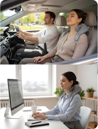 Massageknuderne roterer i flere retninger og efterligner berøringen fra hænder. De løsner målrettet stramme muskler i nakke, nakkeregion og ryg og giver lindring af både smerte og stress.