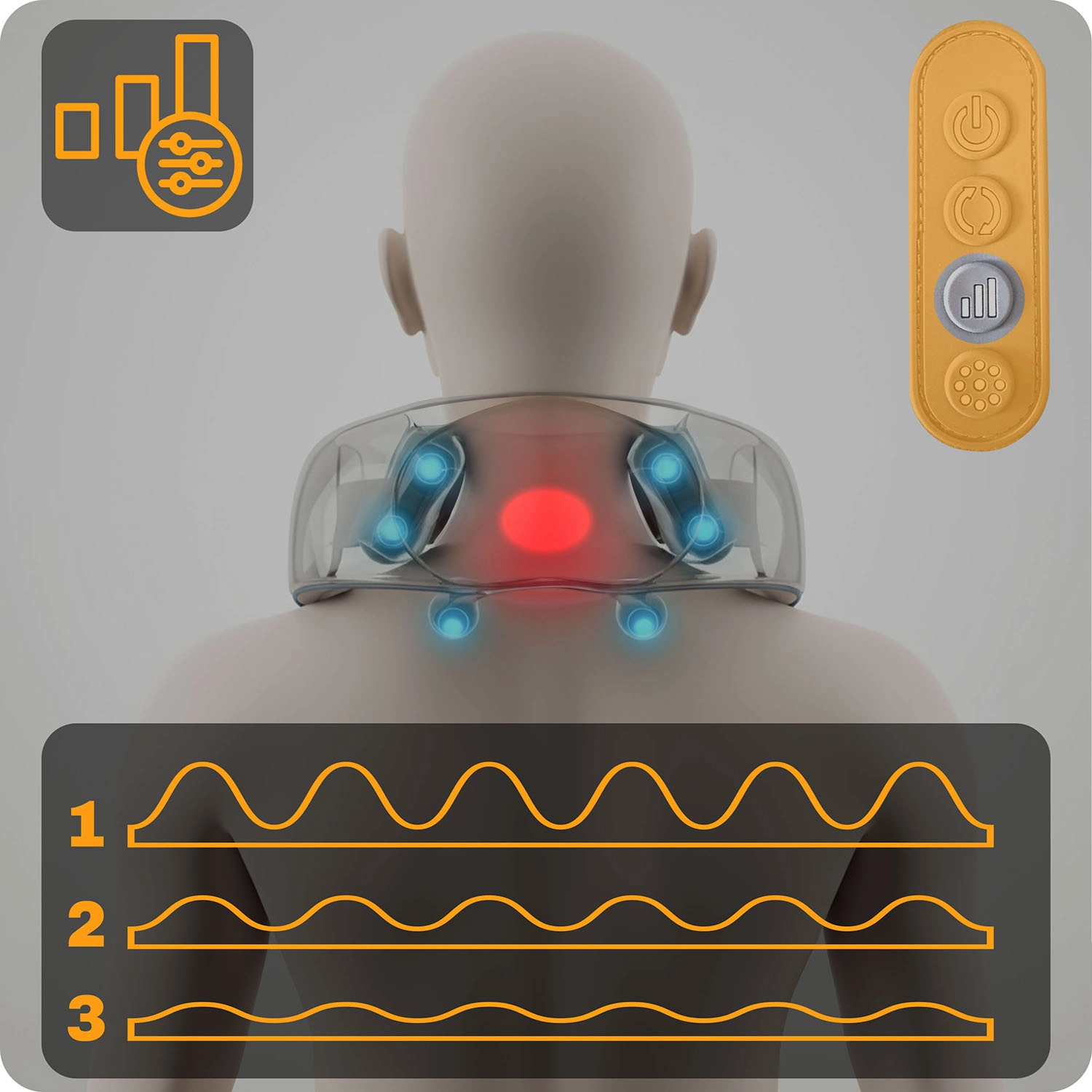 Det intuitive panel lader dig med ét tryk skifte mellem 3 intensitetsniveauer, rotationsretning og varme. Takket være de justerbare stropper kan du nemt tilpasse trykket – enten ved at trække til manuelt eller bruge bagstroppen til håndfri afslapning. Enheden er ideel til nakke og nakkeregion, skuldre, ryg og lænd samt til lår og lægge efter sport eller lang tids siddende.