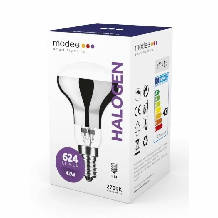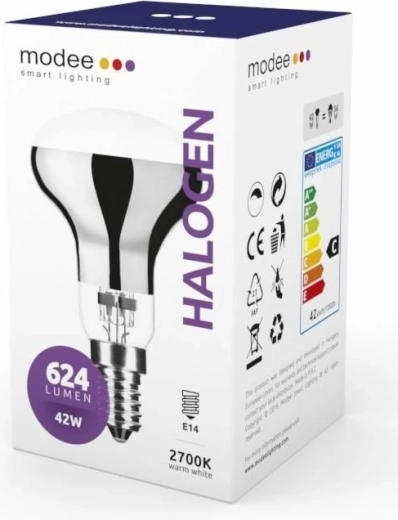 Energibesparende halogenpære R50 med E14-fatning og effekt på 42 W tilbyder øjeblikkelig fuld lysstyrke, dæmpbart lysudbytte på 624 lm og varmt hvidt lys 2700 K. Takket være den brede strålevinkel på 120° oplyser den rummet effektivt, og en specialkonstruktion med IR-refleksion øger effektiviteten. Energiklasse C, levetid op til 2000 t.