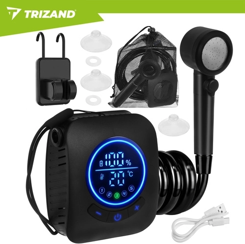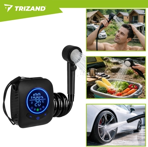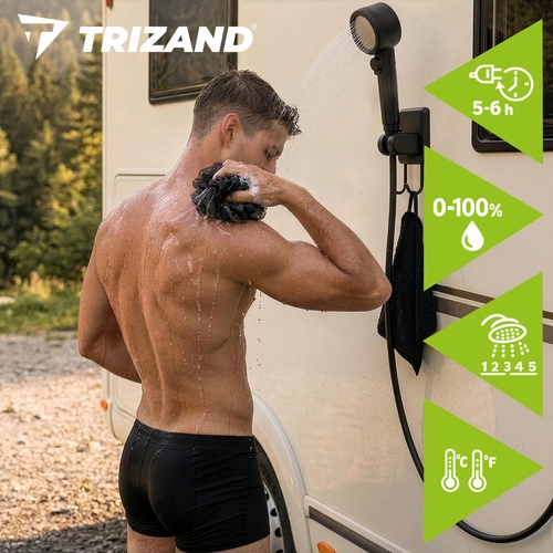 Den bærbare TRIZAND-bruser med et batteri på 8000 mAh giver dig nem adgang til vand hvor som helst – på camping, stranden eller i haven. Den tilbyder et kraftigt pumpeflow på 5–10 l/min, 5 trykniveauer og 4 stråletilstande for maksimal komfort. Et moderne LED-display viser vandtemperatur og batteristatus, og IPX8-tæthed samt opladning via USB 5 V sikrer sikker og enkel brug i felten.