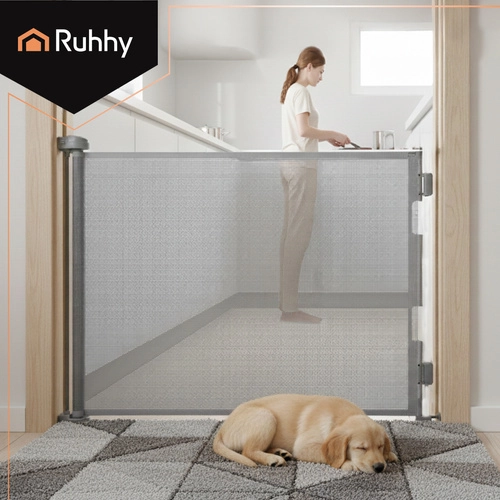 Den praktiske rullegrind RUHHY tilbyder jævn udtræk op til 157 cm, så du nemt kan tilpasse den til både smalle og brede åbninger. Tærskelfri løsning minimerer risikoen for at snuble, og når den er rullet ind, fylder den minimalt. Kombinationen af PVC-skærm, aluminiumsrør og robuste plastdele gør grinden stabil og modstandsdygtig til daglig brug.