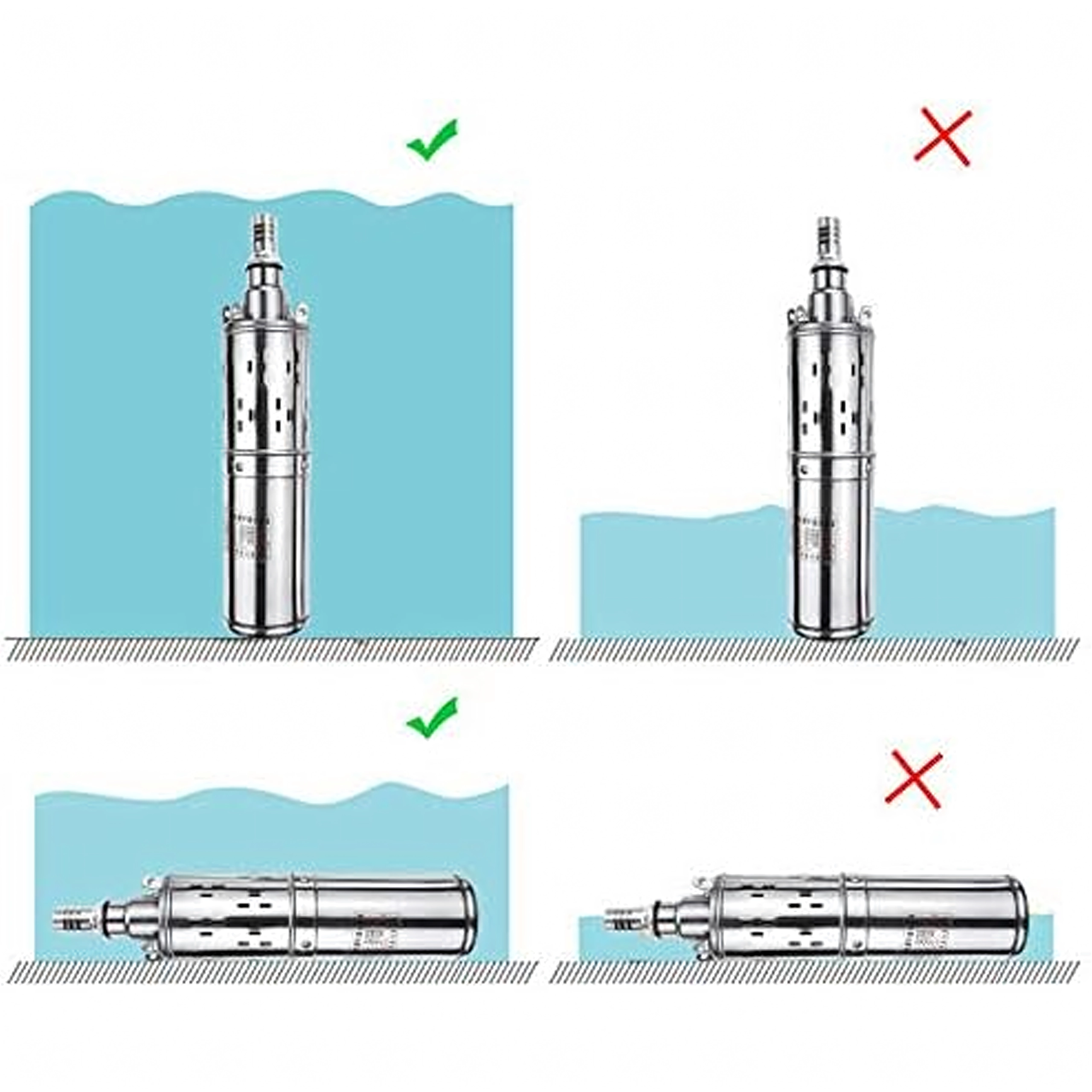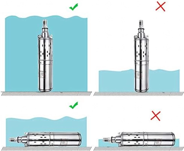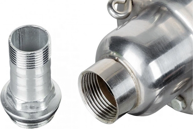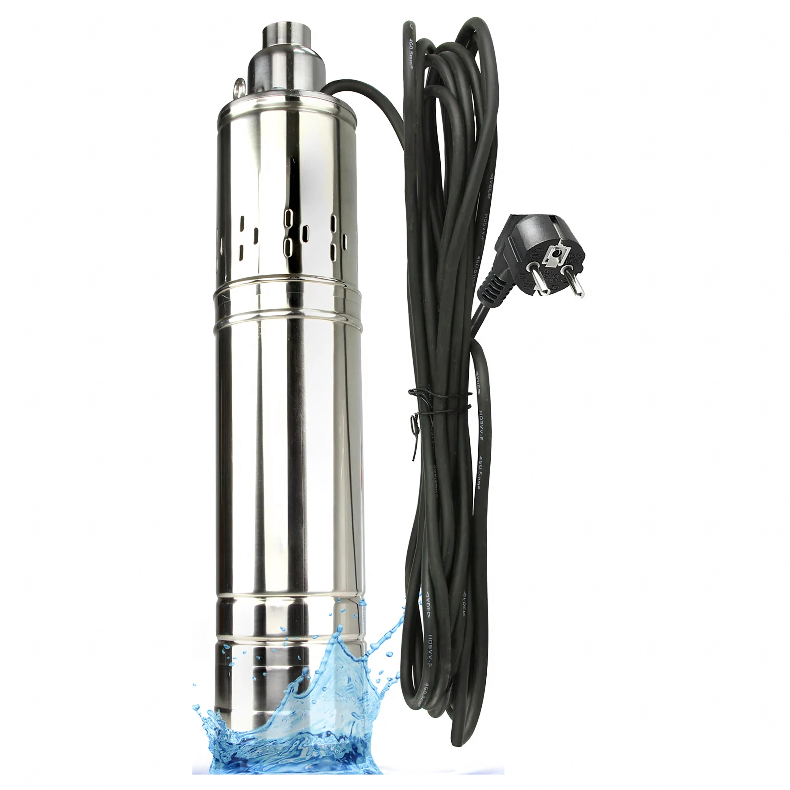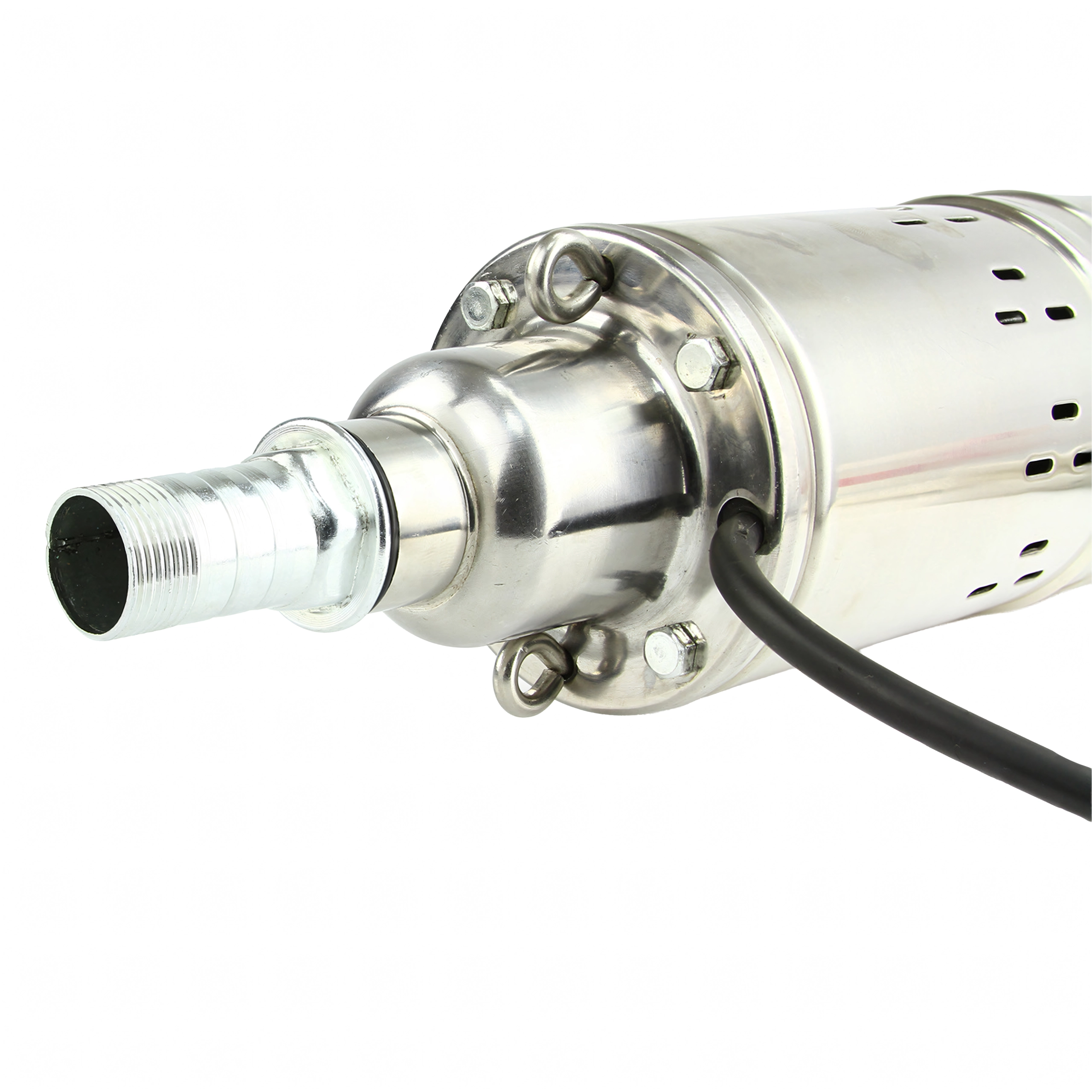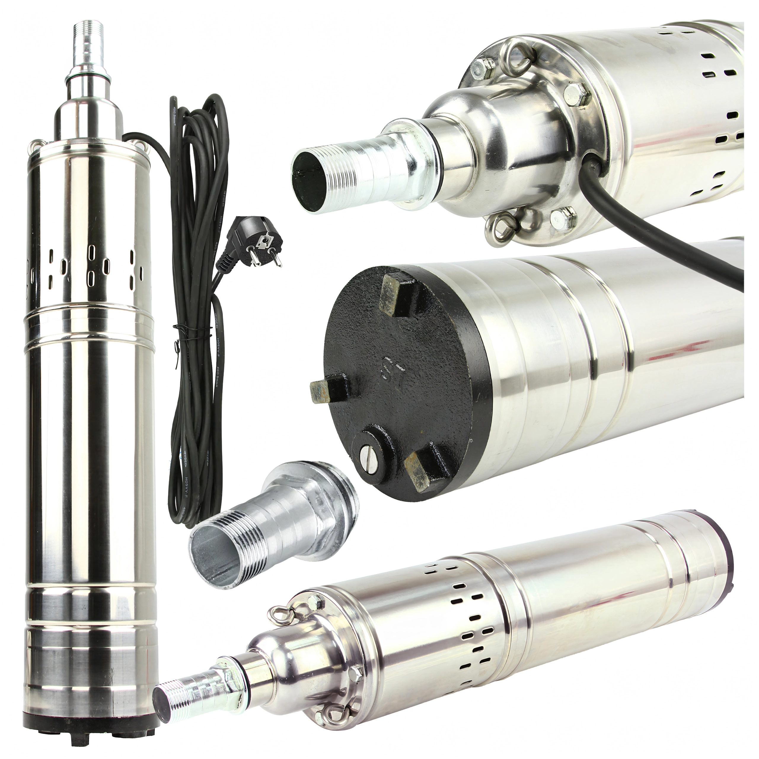Gevindudgang til hurtig tilkobling af slanger, robust strømledning og kompakt vertikal form for enkel nedsænkning i brønden.