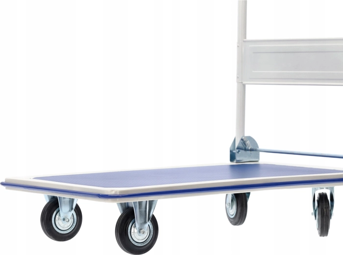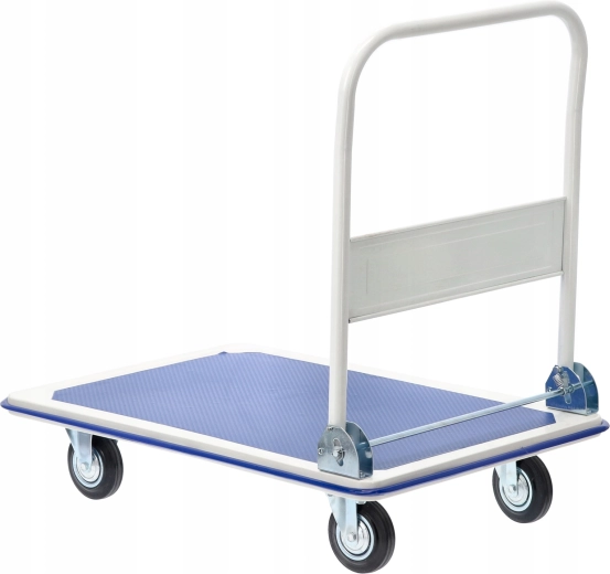 Praktisk platformsvogn med robust konstruktion og en bæreevne på op til 300 kg gør det nemt at transportere pakker, kasser og værktøj på værkstedet, kontoret eller lageret. De kompakte mål, sammenklappeligt håndtag og drejelige hjul sikrer let manøvrering og pladsbesparende opbevaring. Den skridsikre teksturerede platform holder læsset sikkert på plads.