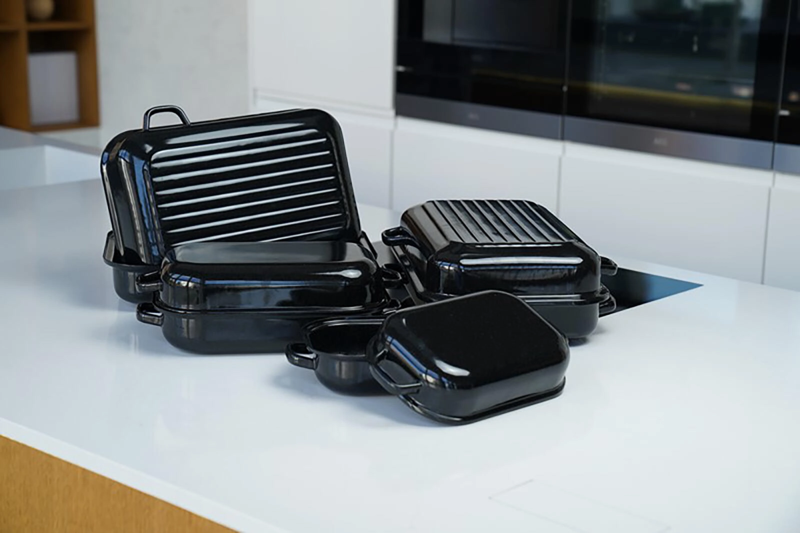 Robust bradepande med låg af emaljeret stål (pladetykkelse 1,2 mm) klarer både daglig stegning og festlige middage. Den glatte, ikke-porøse emalje er let at rengøre, hygiejnisk og modstandsdygtig over for ridser. Den bølgede bund fremmer en sprød skorpe, leder overskydende fedt væk og hjælper med jævn gennemstegning.