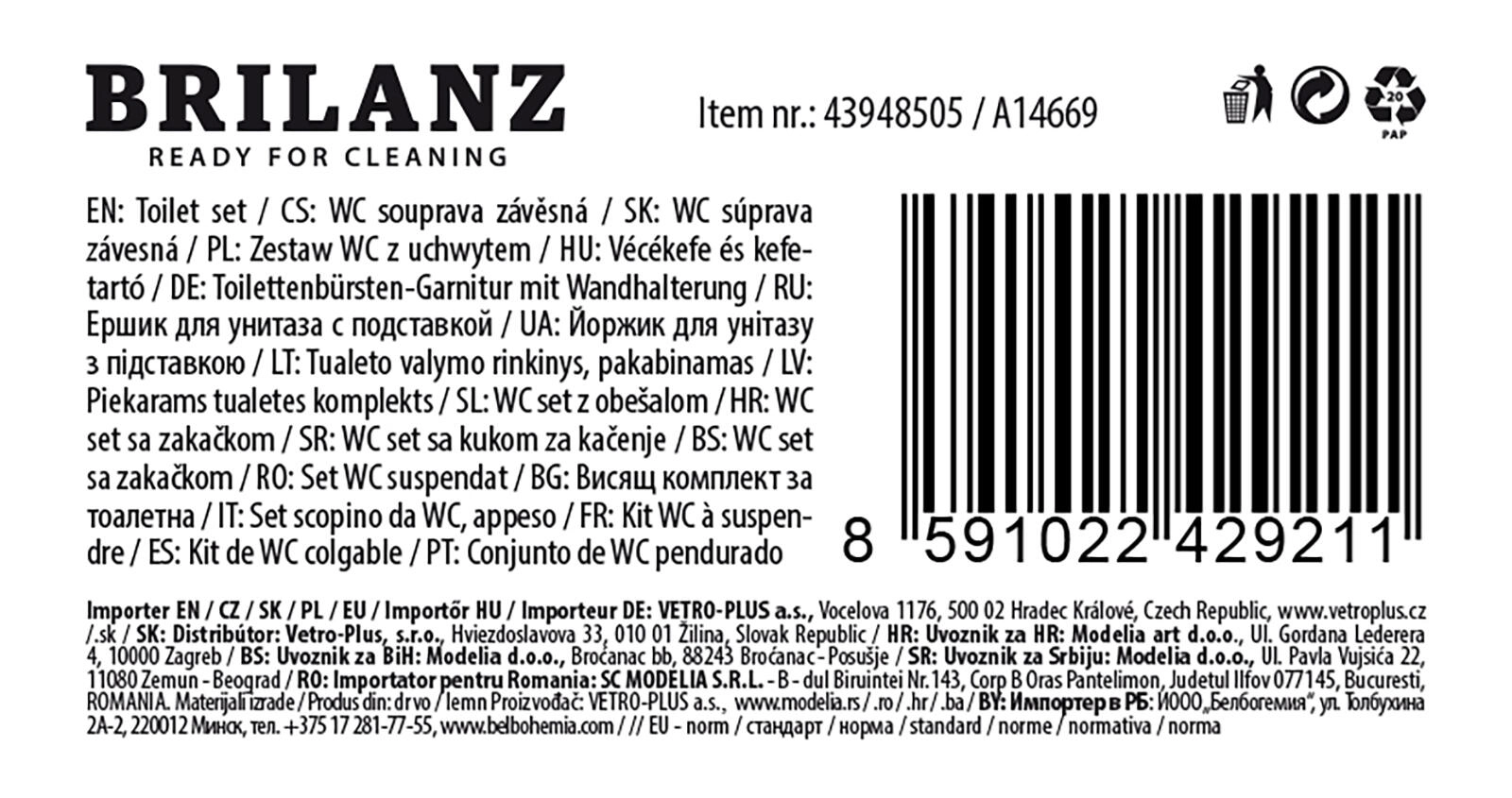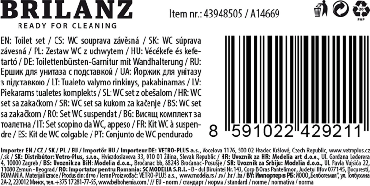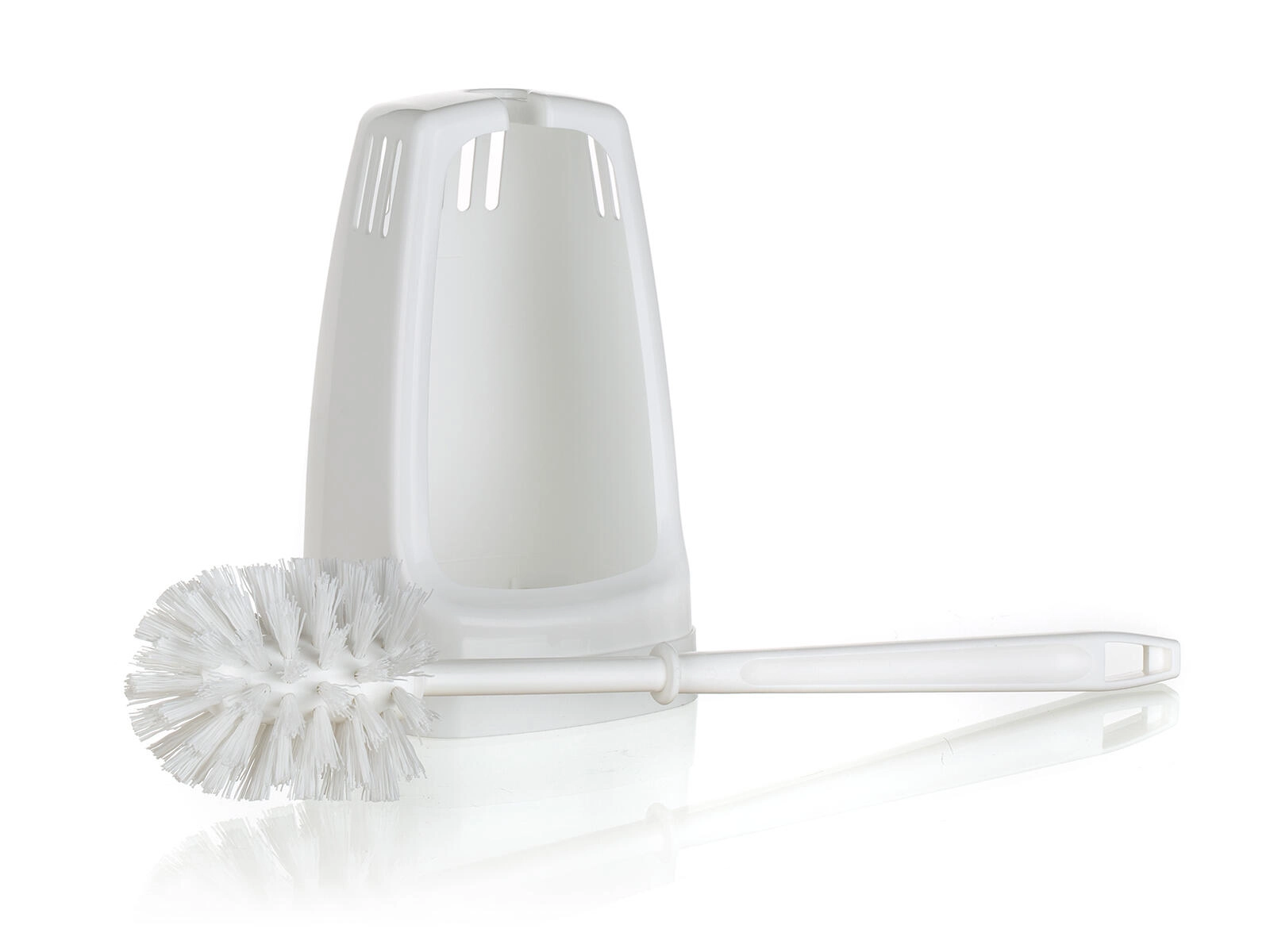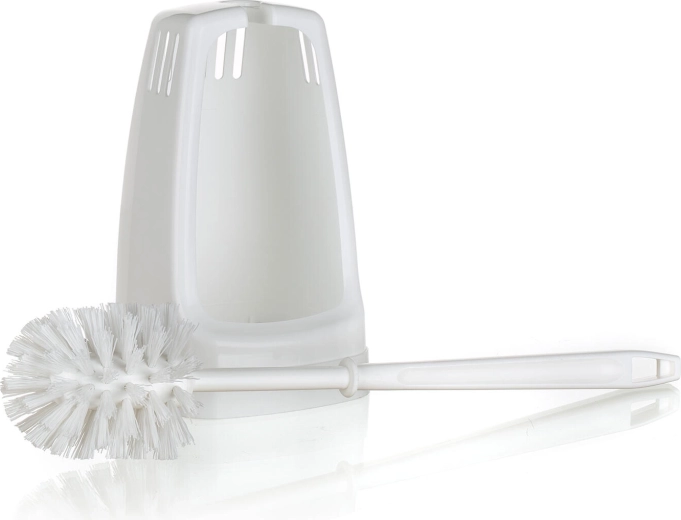 Praktisk WC-sæt med firkantet holder til daglig toilet-hygiejne. Tilbyder kompakte mål, holdbart plastmateriale og en børste med diameter 7 cm med syntetiske fibre for effektiv rengøring. Inkluderer en stoppere på håndtaget, som holder børsten sikkert i holderen.