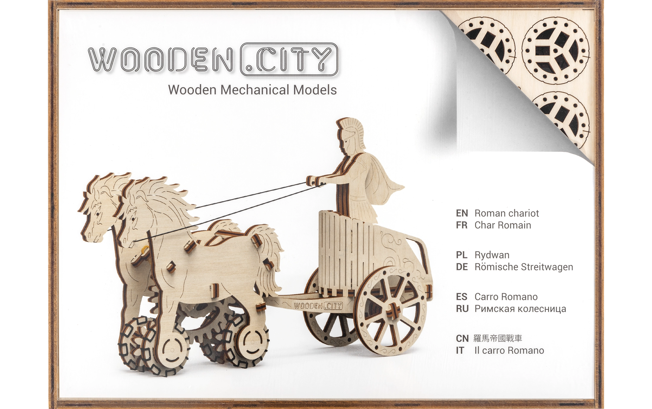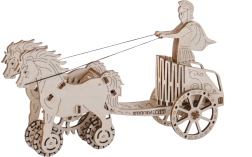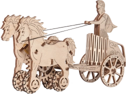 I imperiets navn. Byggesæt af en romersk vogn med dobbelt forspand, lavet af krydsfiner. I den troværdigt gengivne vogn er der placeret en detaljeret figur af en romersk rytter. Takket være det optrækkelige mekanisme kan modellen køre; ved start kan den få forspandet til at stejle og kører op til 1 meter. Arrangér løb med andre Wooden City-modeller! Udstyret med en detaljeret samlevejledning. Hovedfunktioner: 74 præcist udskårne dele, lav samlingssværhedsgrad, den færdige model kan køre selvstændigt