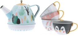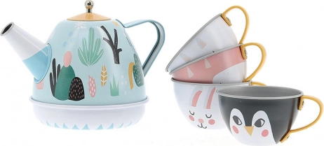 Dette kvalitets te-sæt i metal glæder alle små værter og værtinder. Inde i kanden er en skjult optræks-musikmekanisme, som ved vip spiller en behagelig melodi og forvandler hver servering til en lille ceremoni. Pastelfarver, søde dyremotiver og rene linjer gør sættet til en smuk gave og en stilfuld detalje på børneværelset.