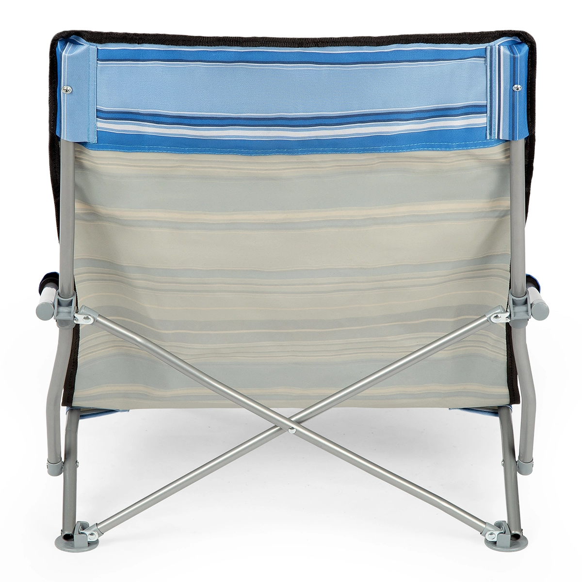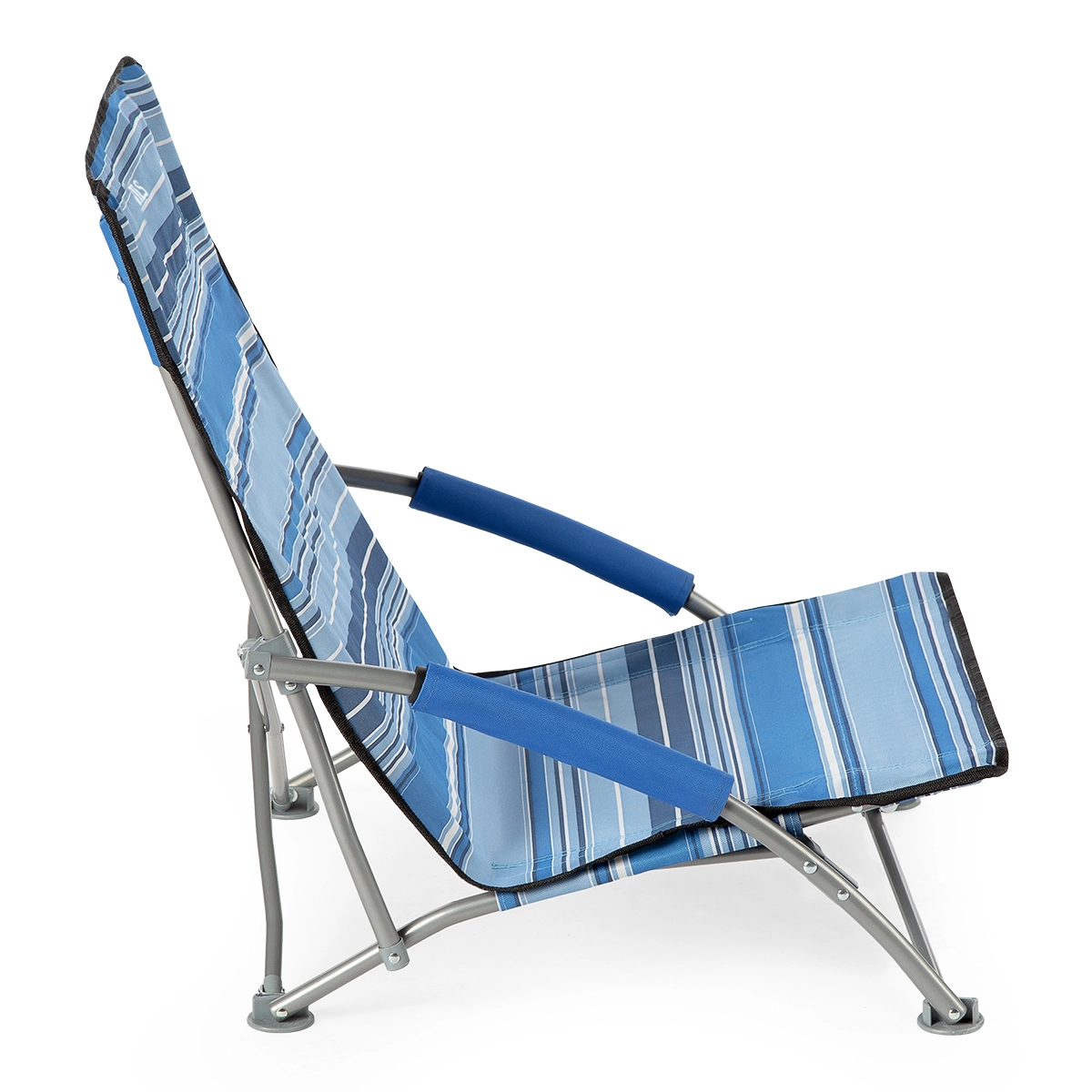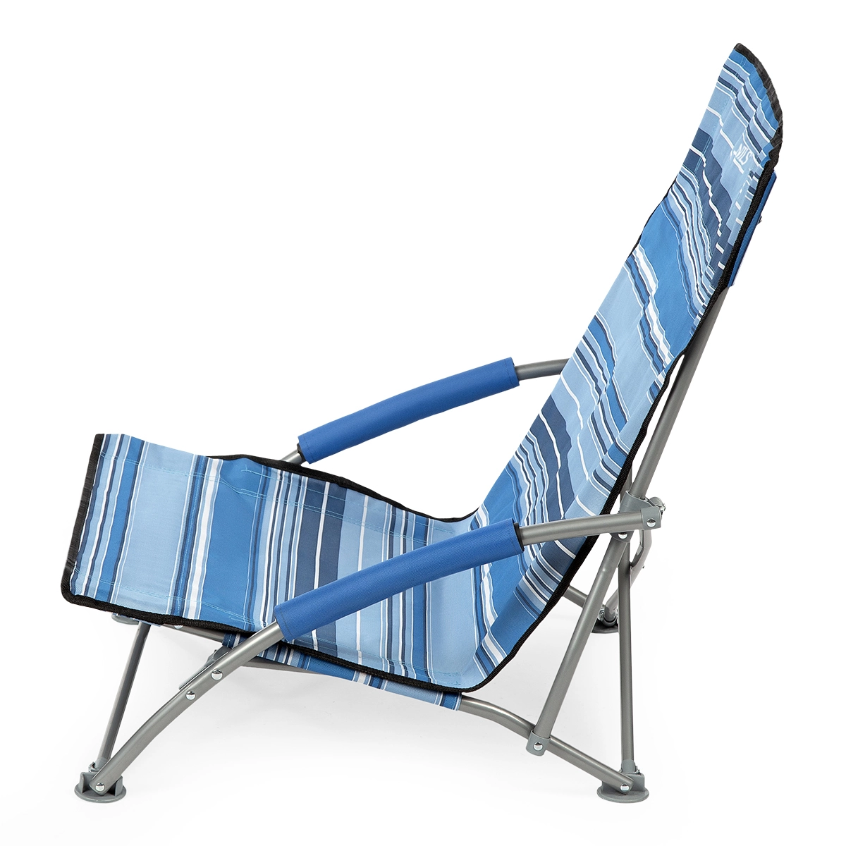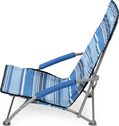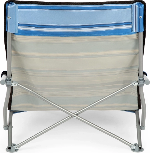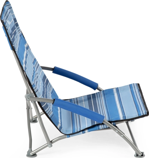Praktiske runde plastikfødder øger stabiliteten og forhindrer, at stolen synker ned i bløde underlag som sand. Skumovertrukne armlæn øger komforten ved længere tids siddning. Når dagen er omme, foldes stolen nemt sammen og lægges i den medfølgende transportpose.