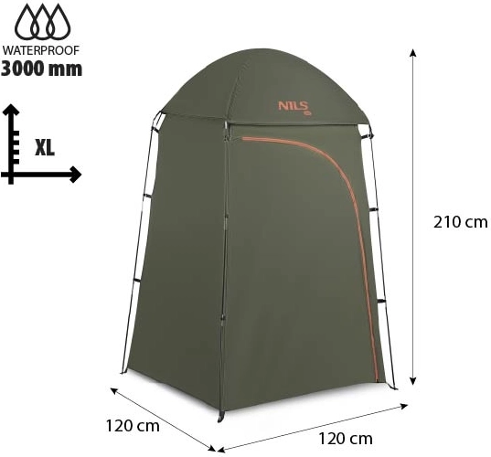 Nyd fuld komfort og privatliv uden for hjemmet. NILS Camp-kabinen er ideel som mobilt omklædningsrum, bruseområde eller toilettelt. Den høje loftshøjde på 210 cm og grundmålene 120 × 120 cm giver rigelig plads til komfortable bevægelser og ophængning af bruseslange.