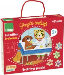 Denne serie indeholder fire progressive puslespil med motiver af forskellige erhverv, designet til at motivere børn til gradvist at blive bedre. Takket være det varierende antal brikker lærer små hænder de rette teknikker til at lægge puslespil og øver sig i at genkende former og farver.
