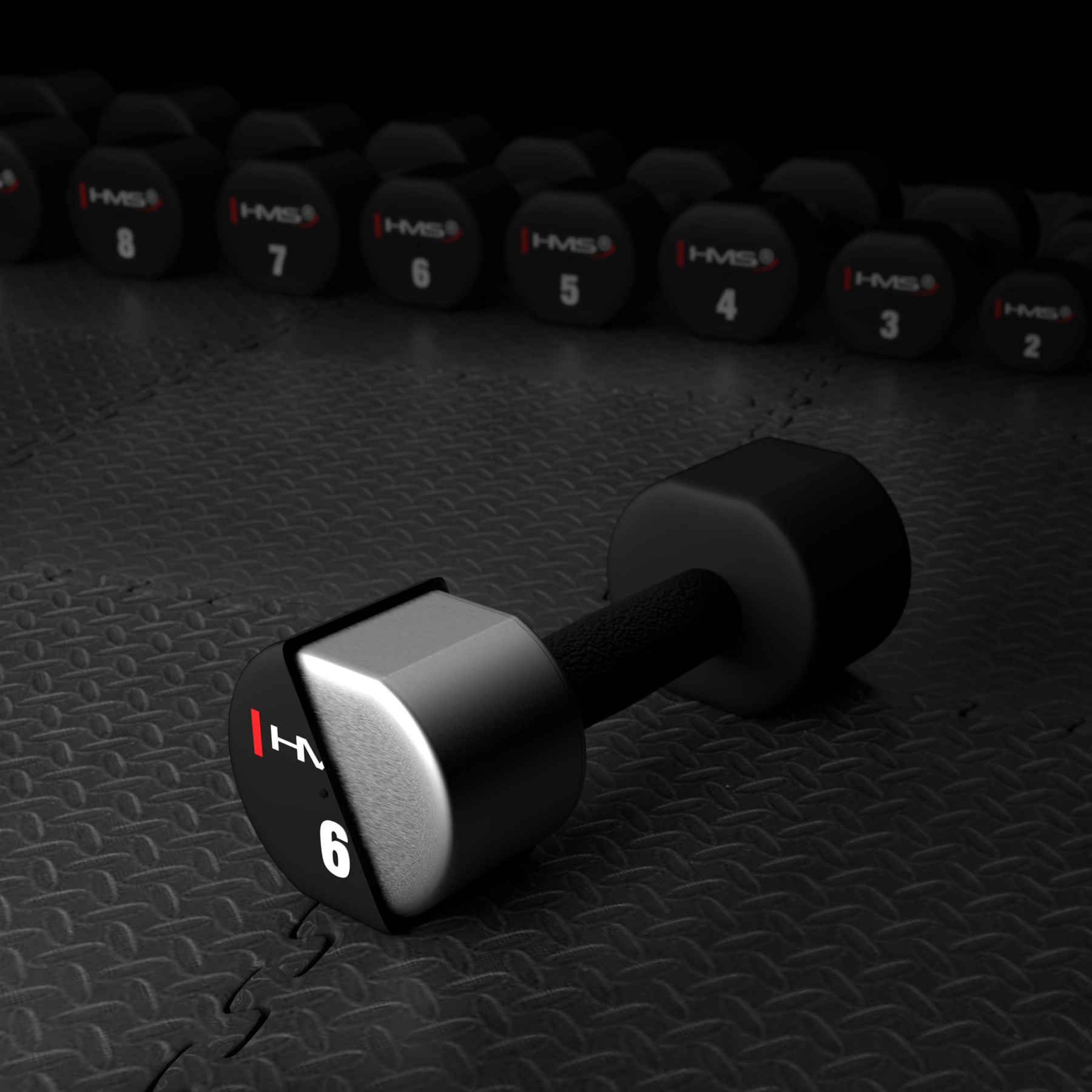 Håndvægtene HMS HPT06 kombinerer en solid stålkernestruktur og termoplastisk polyurethan (TPU), som er elastisk, slagfast og lugtfri. Takket være TPU-overfladen beskytter de gulvet mod skader og dæmper støj ved nedlægning af vægtene. Tydelig vægtangivelse gør det hurtigere at vælge den rigtige belastning under træningen.