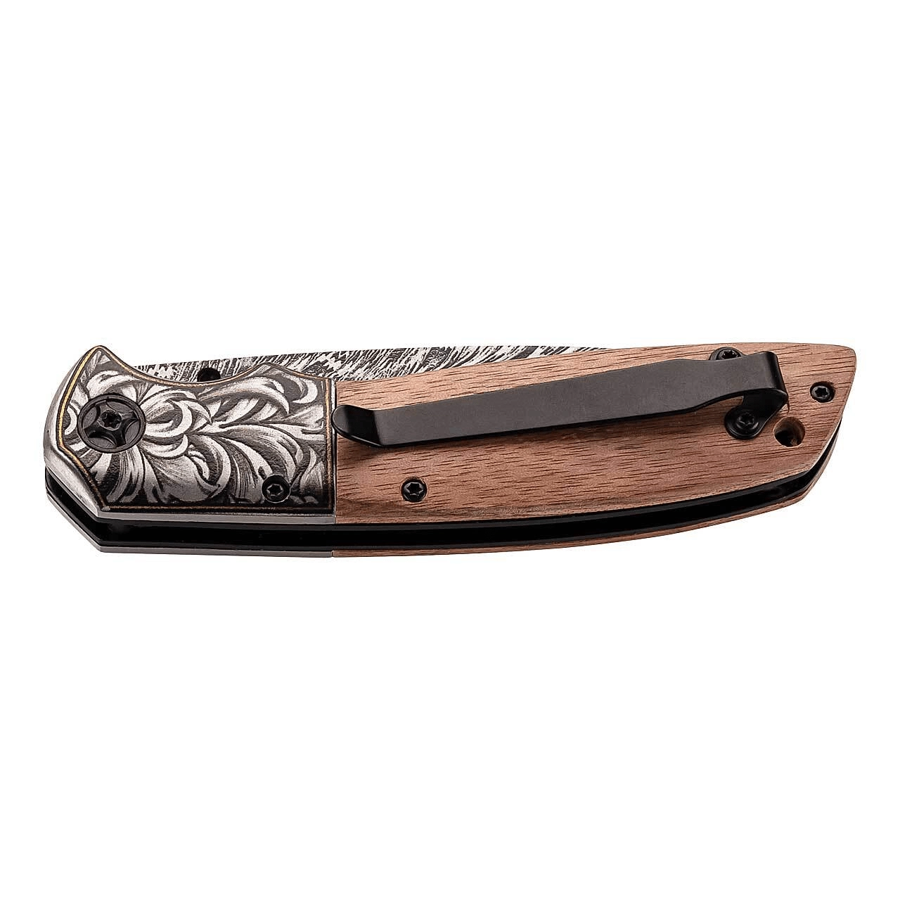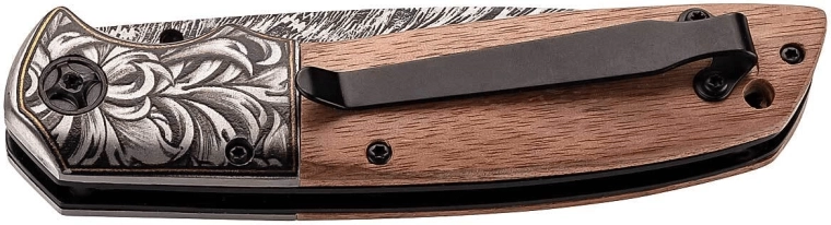 Elegant foldekniv HERBERTZ til daglig brug eller som en stilfuld gave. Den tilbyder en klinge i rustfrit stål AISI 420 med indgraveret blomstermotiv, bekvem åbning med tommelstud og sikker Linerlock-låsning. Skæftet i valnøddetræ ligger godt i hånden, og der er lommeclip til højrebåret samt hul til snor.