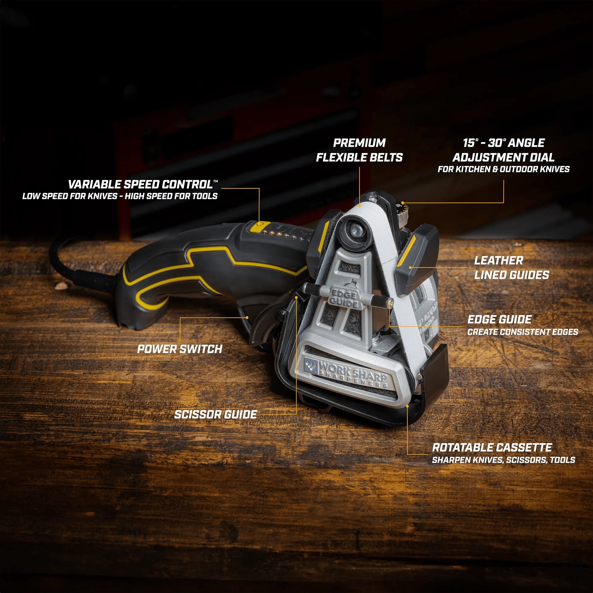 Den professionelle elektriske kniv- og værktøjssliber WORK SHARP Ken Onion Edition MK2 leverer hurtig, præcis og ensartet slibning takket være fleksible slibebånd, justerbare vinkelguider 15°–30° og en motor med variabel hastighed. Ideel til køkkenknive, outdoor- og foldeknive, sakse, økser og havetøjsredskaber.