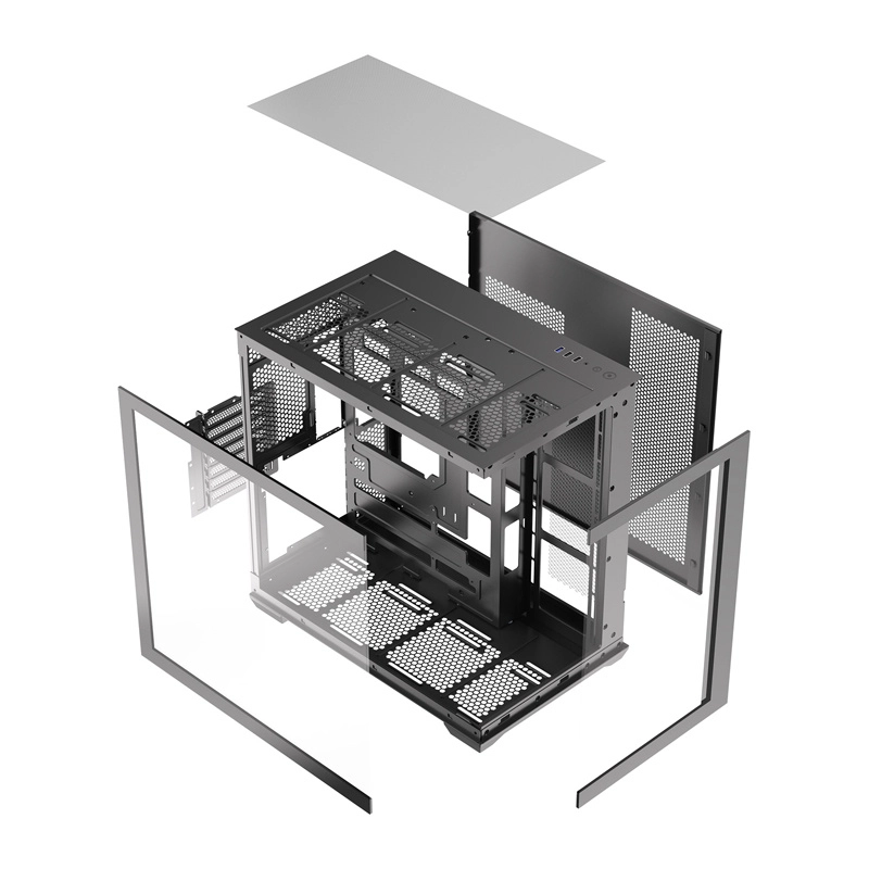 Uden en lodret hjørneprofil får du uhindret udsyn til komponenter og RGB—ideelt til præsentations- og gaming-opsætninger.
