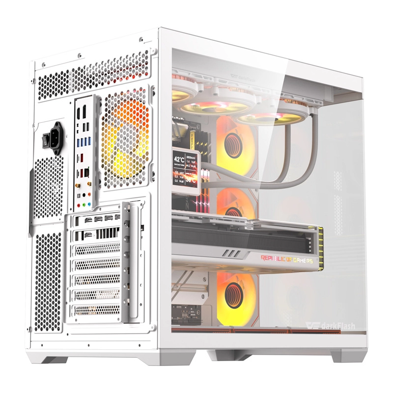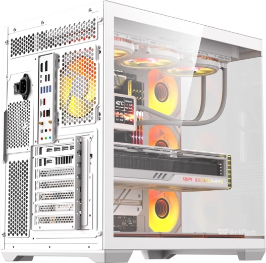 Stilfuldt og rummeligt PC-kabinet DarkFlash C280 i hvid farve tilbyder et panoramisk 270° design med hærdede glasplader, support til bundkort op til E‑ATX og installation af op til 10 blæsere eller AIO‑radiatorer op til 360 mm. I pakken er der allerede 7 forinstallerede 120 mm blæsere for effektiv køling, desuden vertikal GPU‑montering, fremragende kabelstyring og praktisk I/O med USB 3.0.