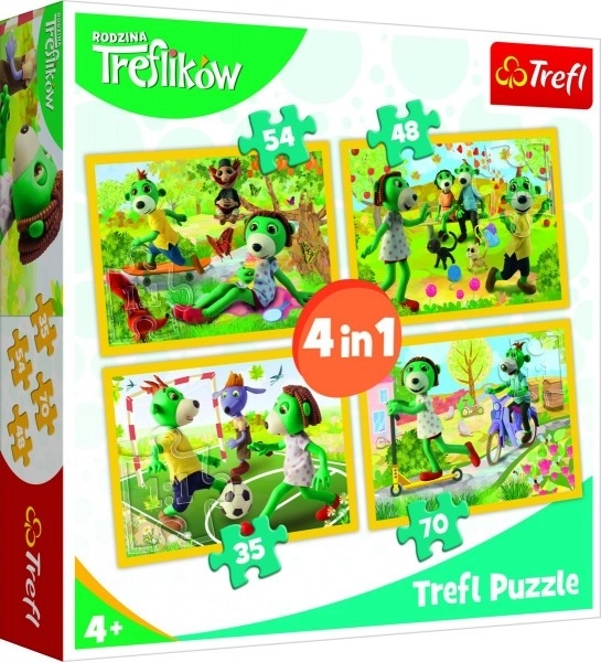 Oplev det sjove puslespil 4-i-1 Treflík-familien med varierende sværhedsgrad for både yngre og ældre børn. Fire separate puslespil i størrelsen 285 × 205 mm vil glæde alle fans af serien. Materialer af høj kvalitet og specialpapir, der reflekterer lys, sikrer behagelig samling. Fremstillet i Polen af miljøvenlige materialer. Velegnet fra 4 år.