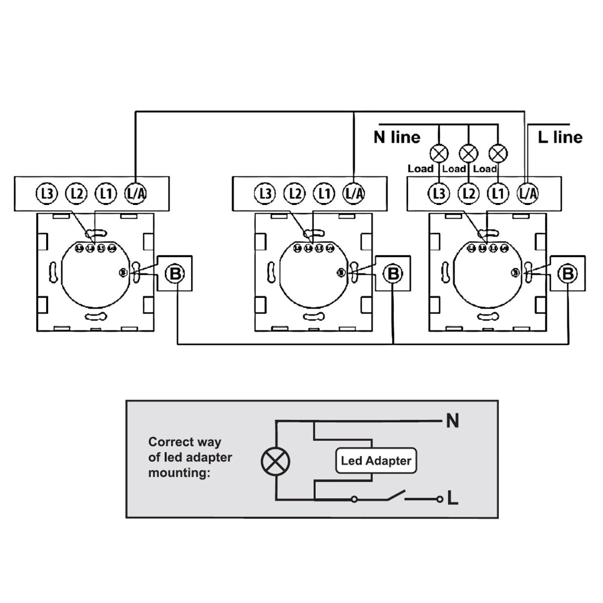 Skrueterminaler og flere udgange til brug som enkeltkanal, trappe- eller krydskontakt inden for den samme elinstallation.