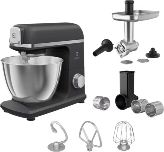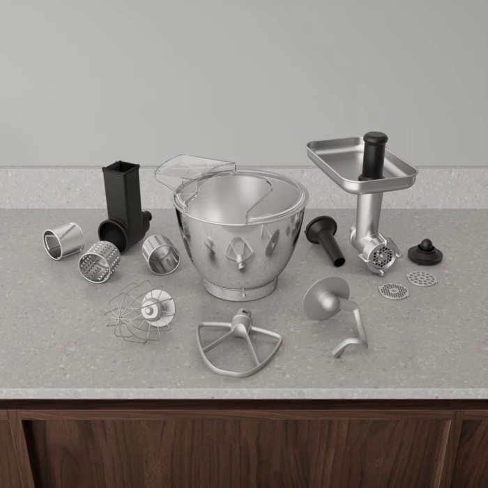 Piskeris, fladpisker, dejkrog, rustfri stålskål med stænklåg samt tilbehør til rivning og kødhakning forvandler maskinen til køkkenets multifunktionscenter.